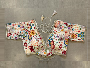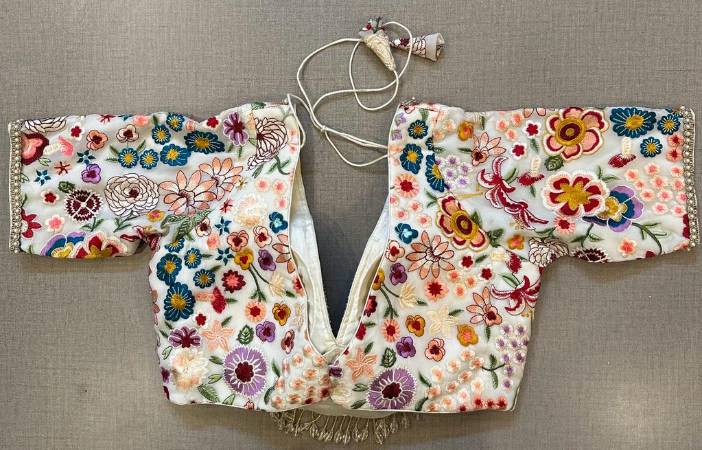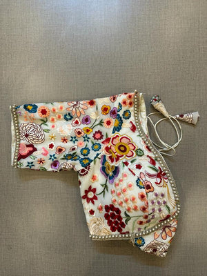 Beautiful cream saree blouse with multicolor floral thread embroidery. Buy designer blouse in USA from Pure Elegance.