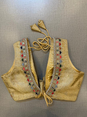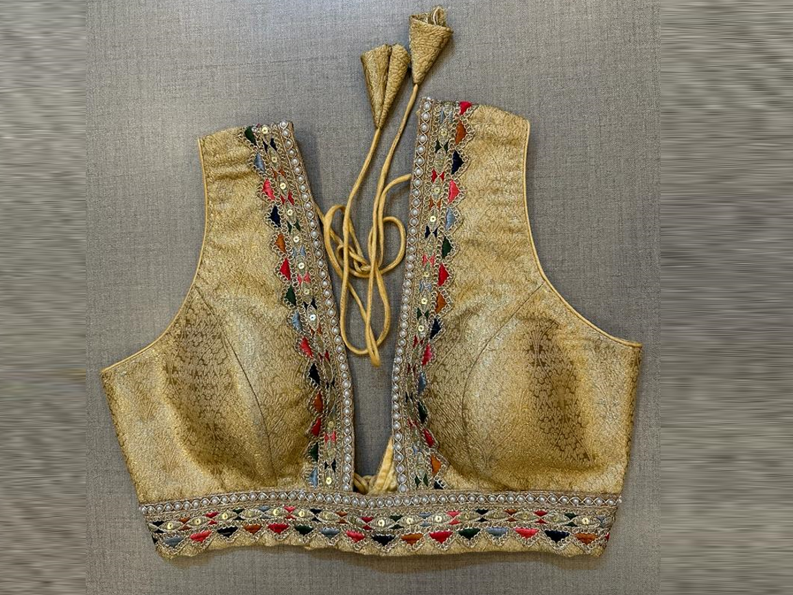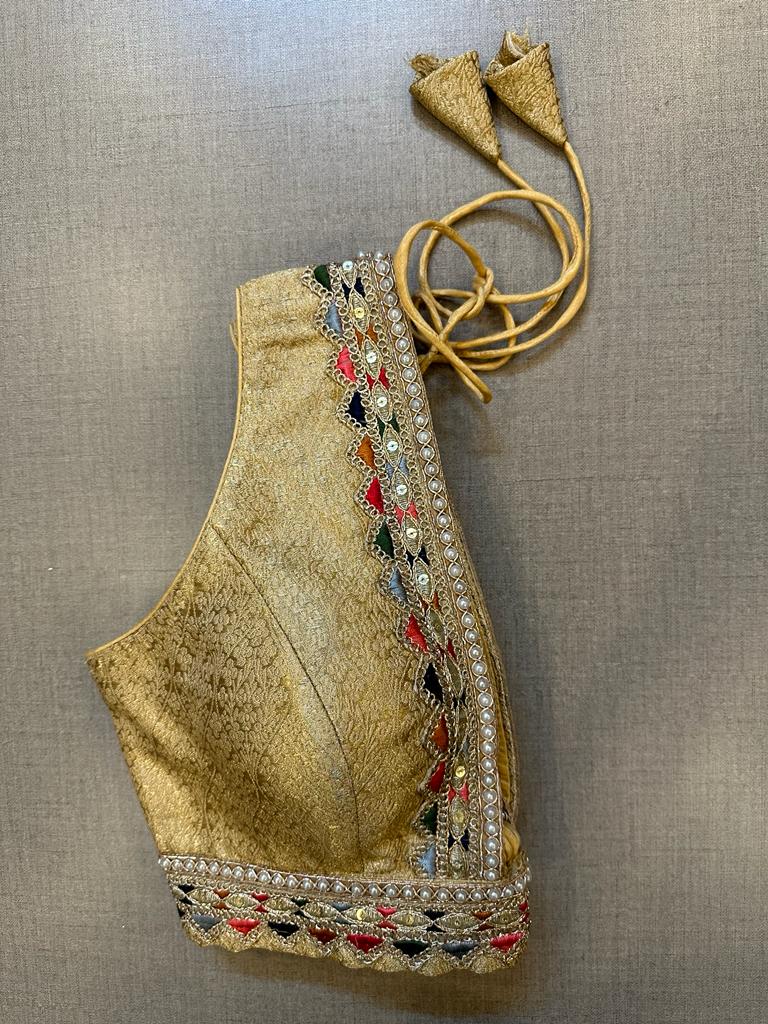 Beautiful golden Banarasi saree blouse with multicolor lace. Buy designer blouse in USA from Pure Elegance.