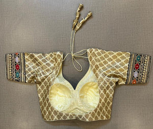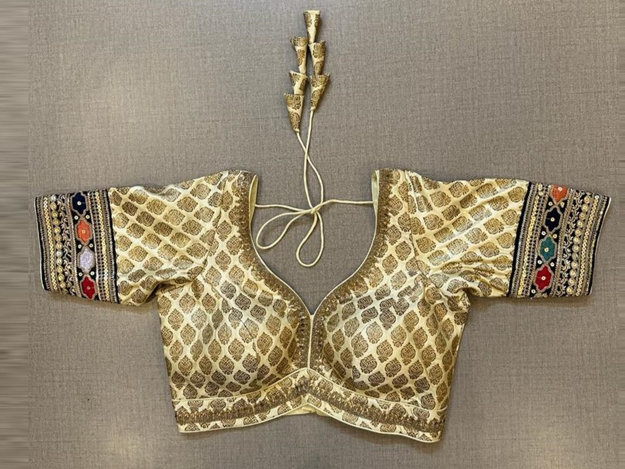 Beautiful cream Banarasi sari blouse with embroidered sleeves. Buy designer blouse in USA from Pure Elegance.
