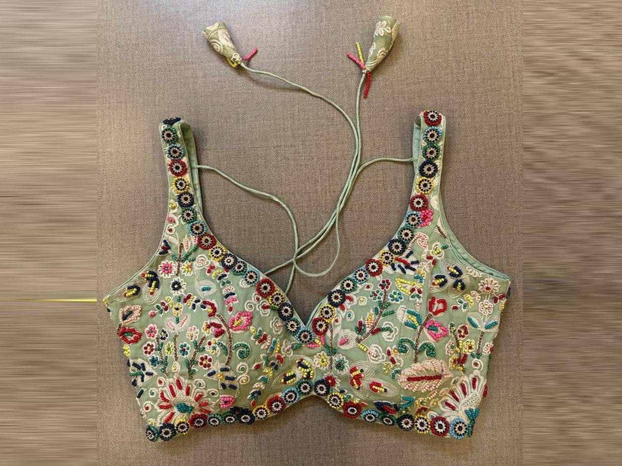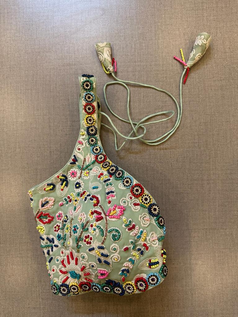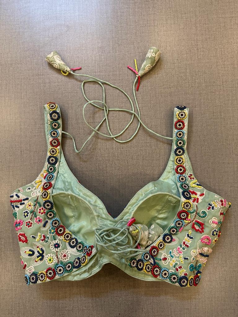 Beautiful sage green hand embroidered sleeveless saree blouse. Buy designer blouse in USA from Pure Elegance.