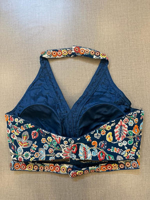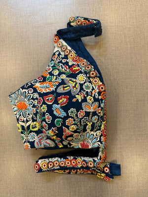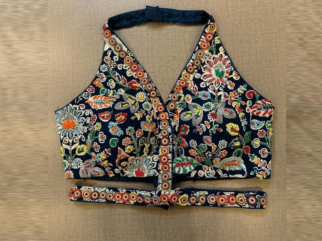 Beautiful dark blue hand embroidered halter saree blouse. Buy designer blouse in USA from Pure Elegance.