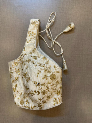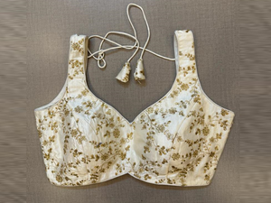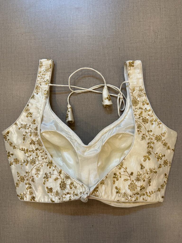 Beautiful off-white machine embroidered sleeveless sari blouse. Buy designer blouse in USA from Pure Elegance.