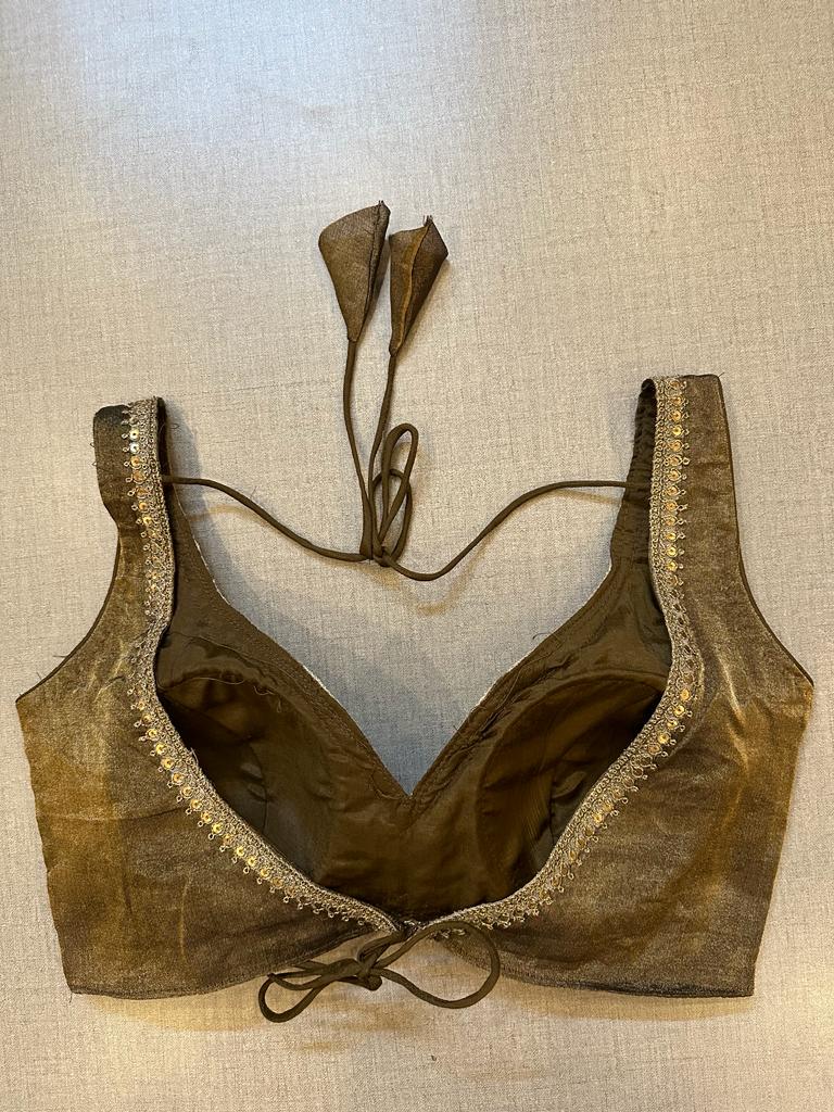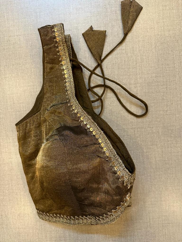 Beautiful olive green tissue sleeveless saree blouse with sequin lace. Buy designer blouse in USA from Pure Elegance.