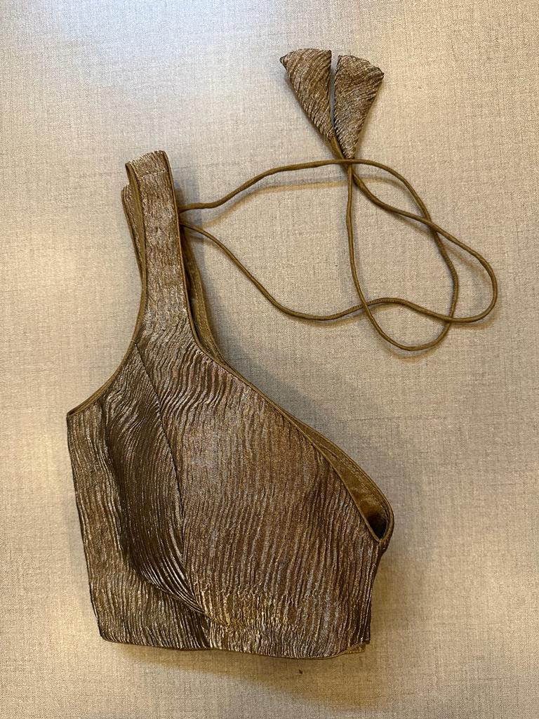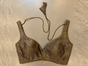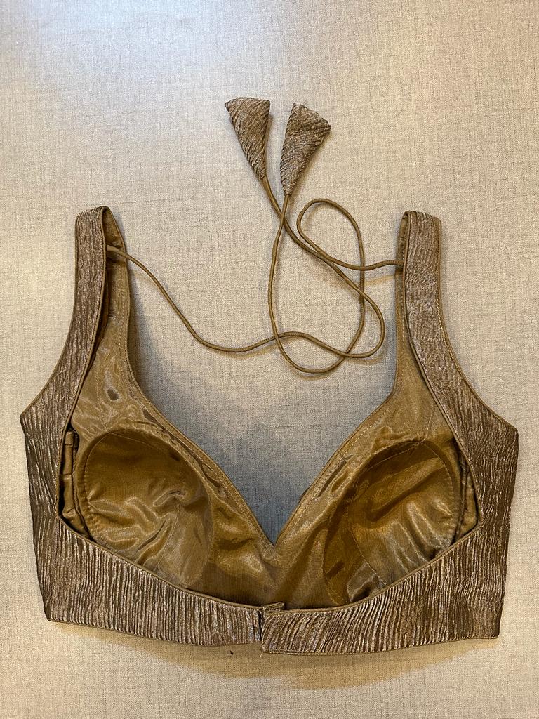 Beautiful brown crushed tissue sleeveless sari blouse. Buy designer blouse in USA from Pure Elegance.