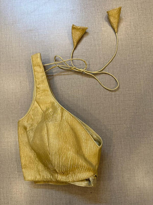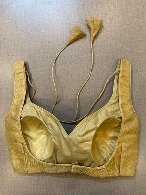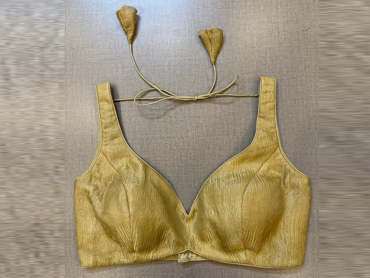 Elegant golden tissue sleeveless sari blouse. Buy designer blouse in USA from Pure Elegance.