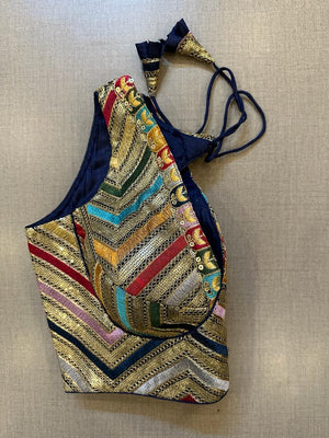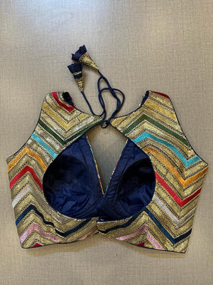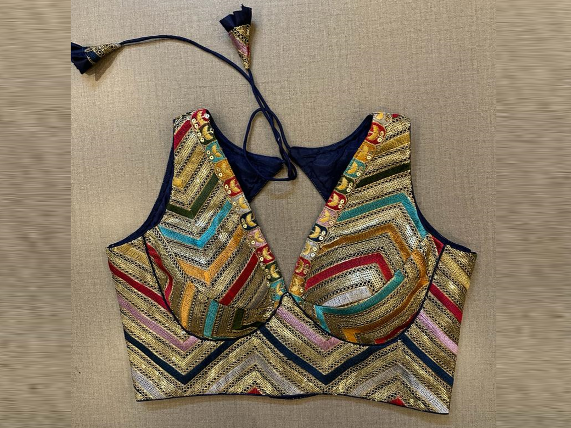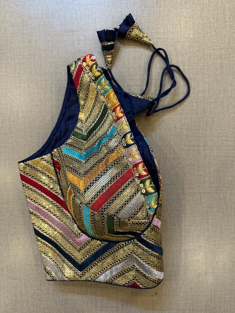 Alluring multicolor embroidery navy blue sleeveless saree blouse. Buy designer blouse in USA from Pure Elegance.