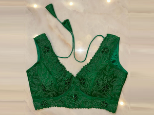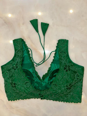 Alluring green hand bead work sleeveless blouse. Buy designer blouse in USA from Pure Elegance.