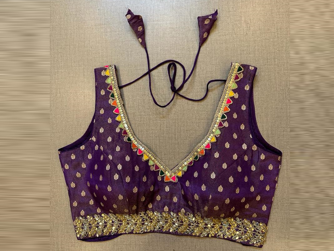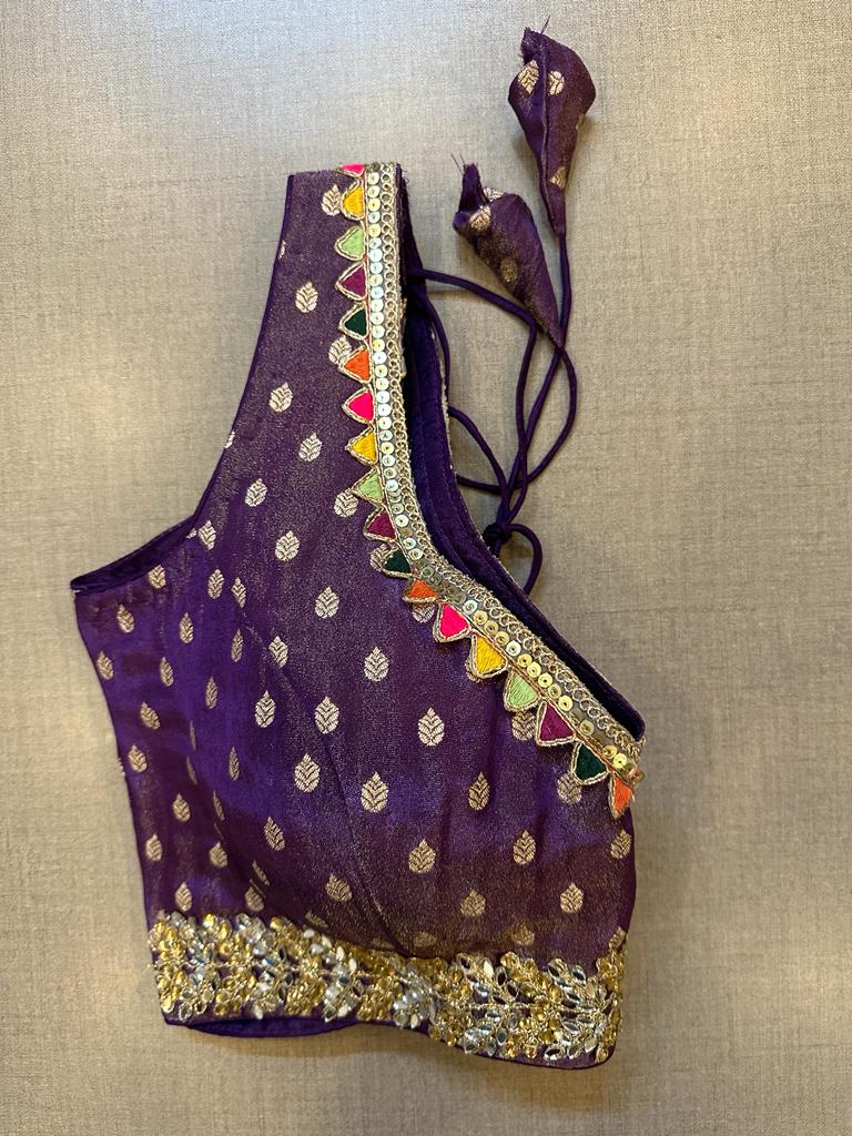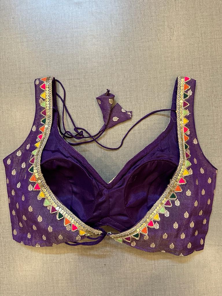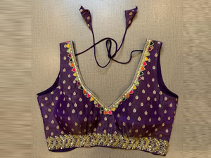 Alluring purple sleeveless blouse with embellished lace border. Buy designer blouse in USA from Pure Elegance.