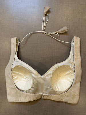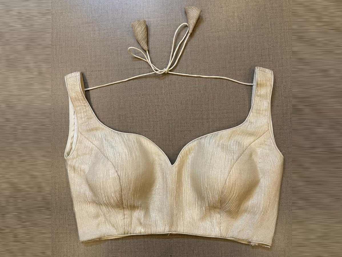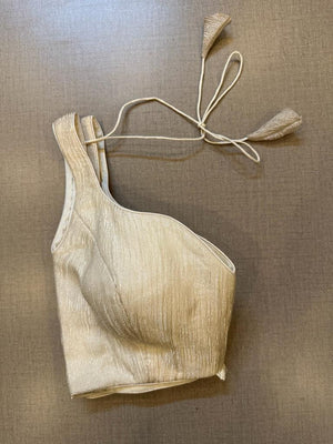 Alluring off-white sleeveless tissue saree blouse. Buy designer blouse in USA from Pure Elegance.