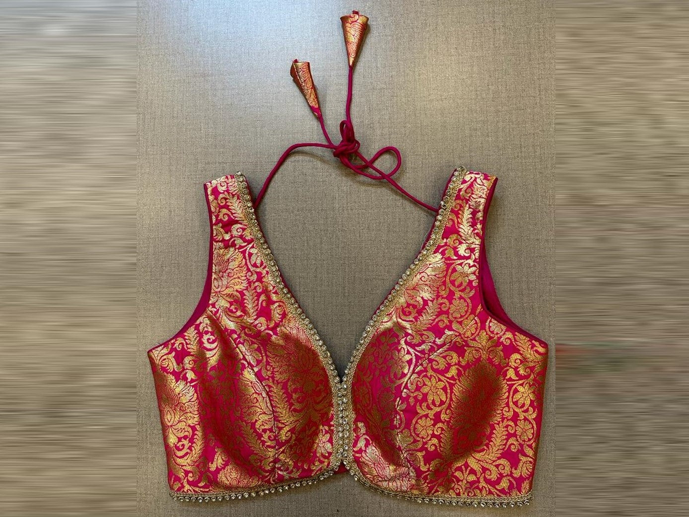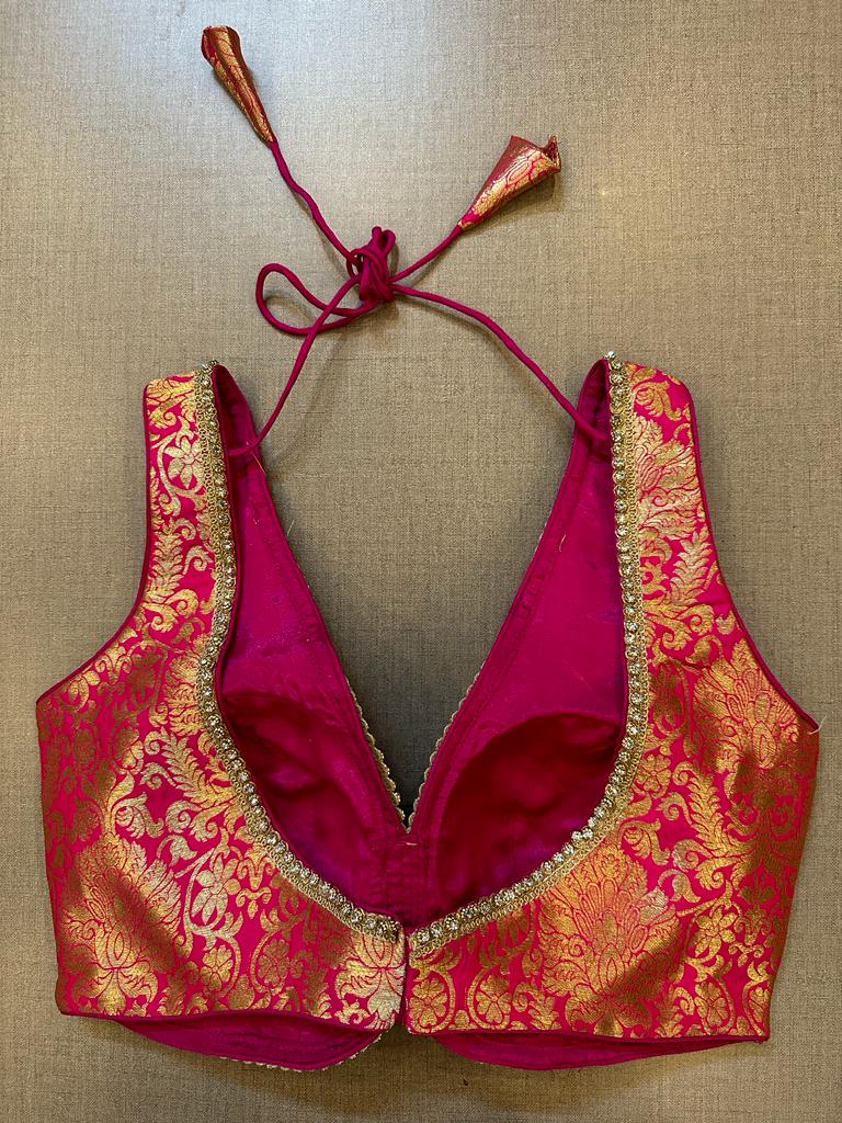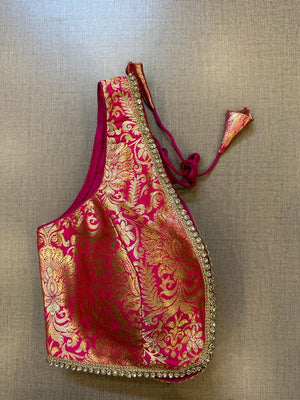 Alluring fuschia pink Banarasi sleeveless saree blouse with stone lace. Buy designer blouse in USA from Pure Elegance.
