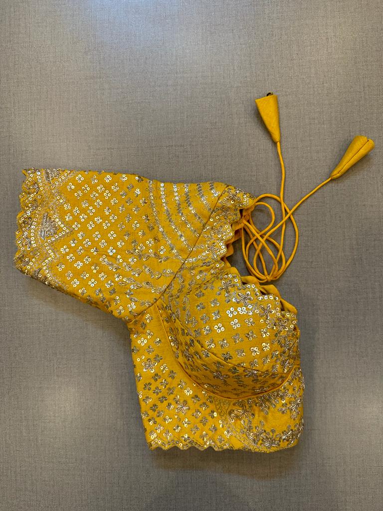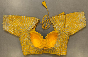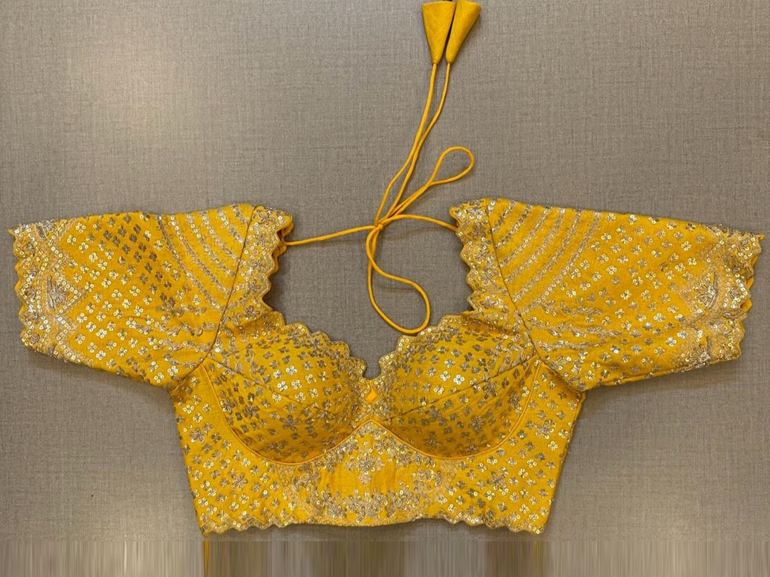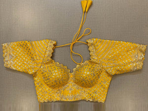 Exquisite yellow hand embroidered choli cut blouse with cut out neckline. Buy designer blouse in USA from Pure Elegance.