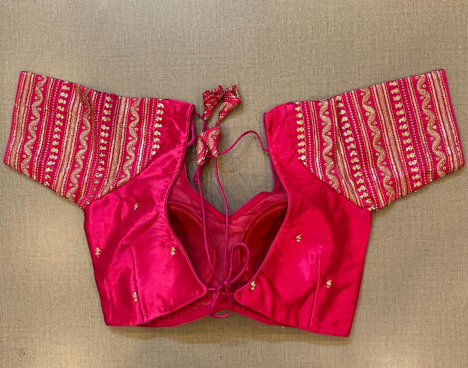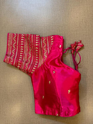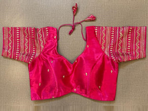 Exquisite pink saree blouse with embroidered sleeves. Buy designer blouse in USA from Pure Elegance.