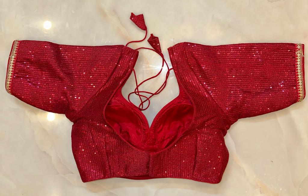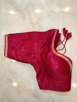 Exquisite dark pink sequin work choli-cut saree blouse. Buy designer blouse in USA from Pure Elegance.