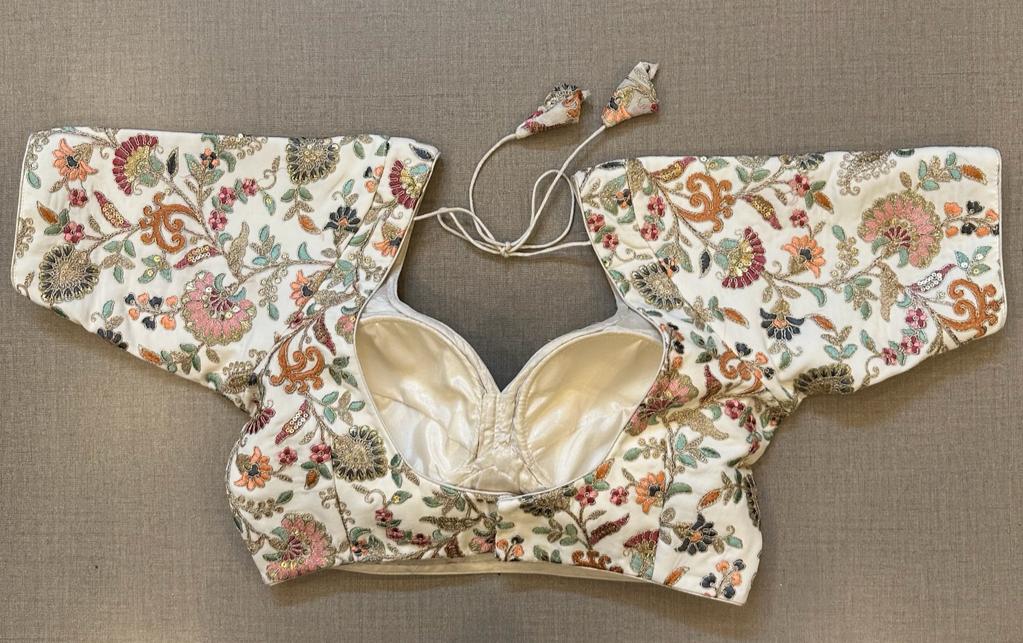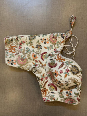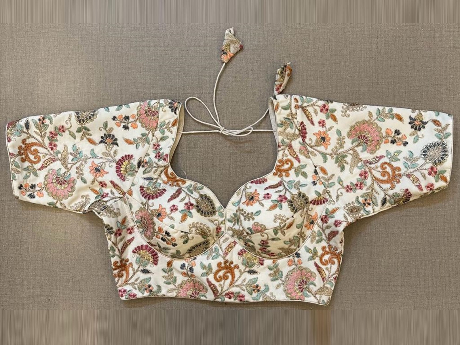 Exquisite off-white multicolor embroidered choli-cut blouse. Buy designer blouse in USA from Pure Elegance.