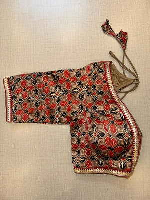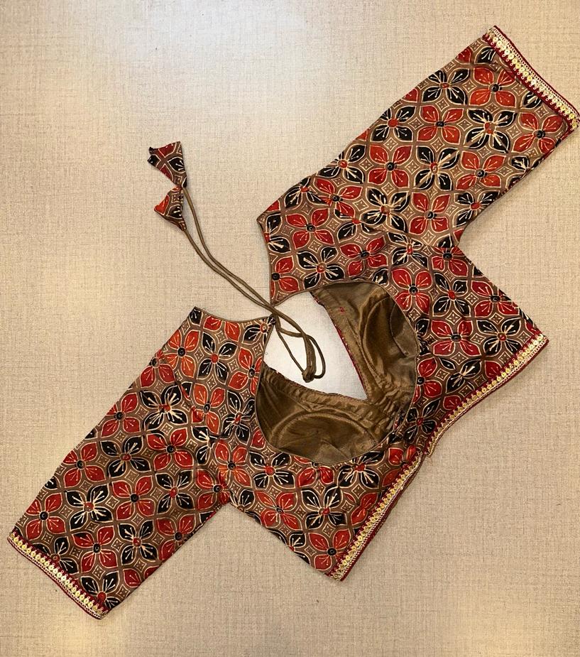 Exquisite brown floral print blouse with sequin lace. Buy designer blouse in USA from Pure Elegance.