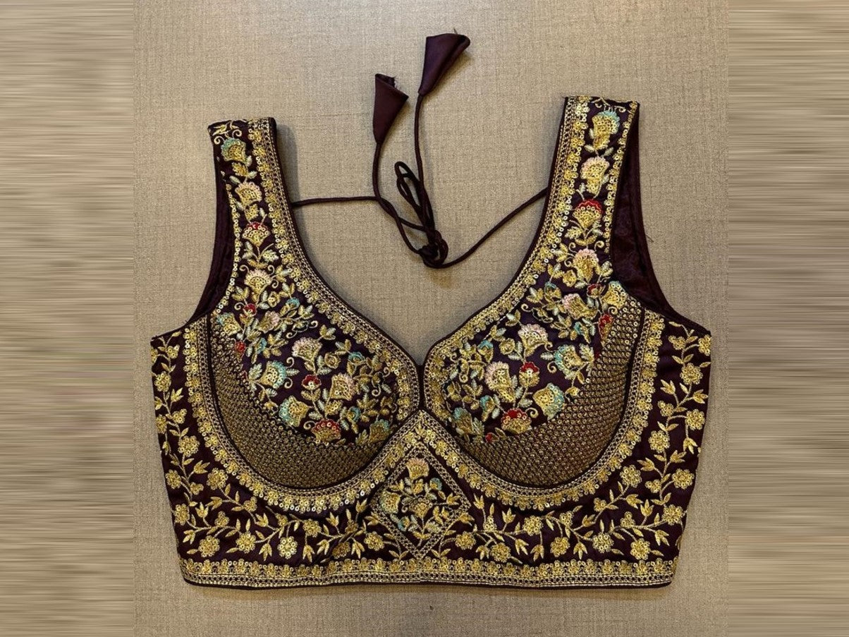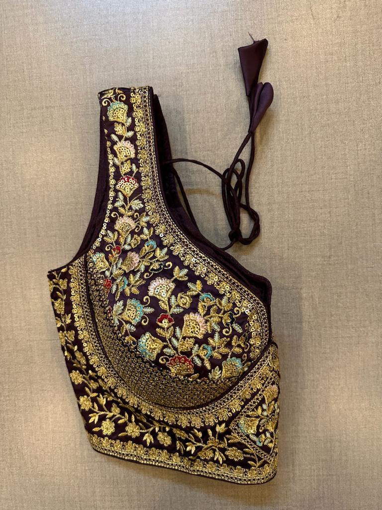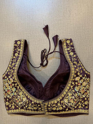 Exquisite purple embroidered designer sleeveless blouse. Buy designer blouse in USA from Pure Elegance.