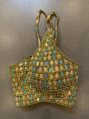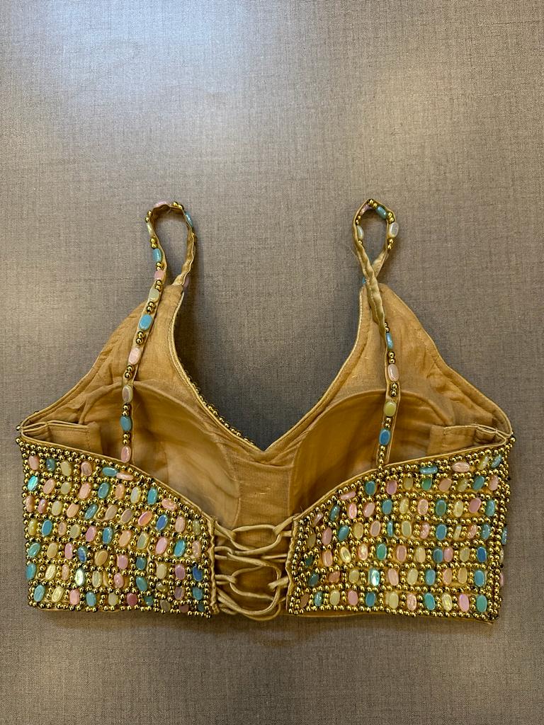Exquisite golden multicolor bead work cocktail saree blouse. Buy designer blouse in USA from Pure Elegance.