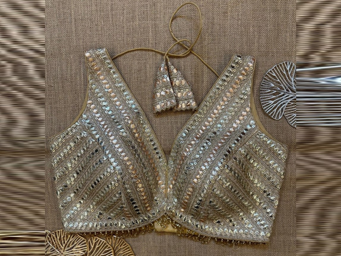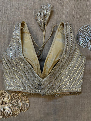 Stunning beige gota and sequin work sleeveless saree blouse. Buy designer blouse in USA from Pure Elegance.