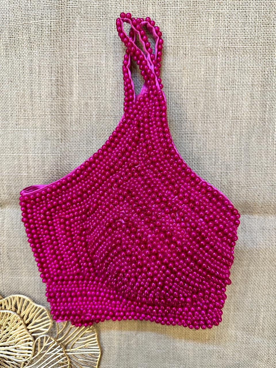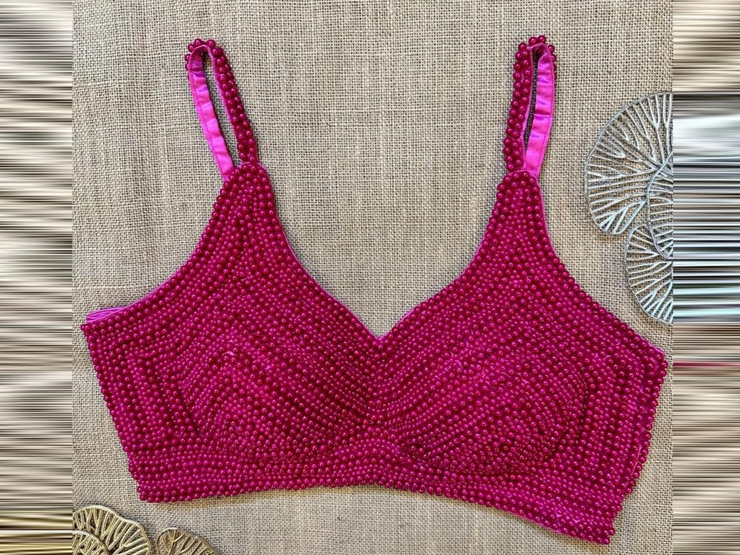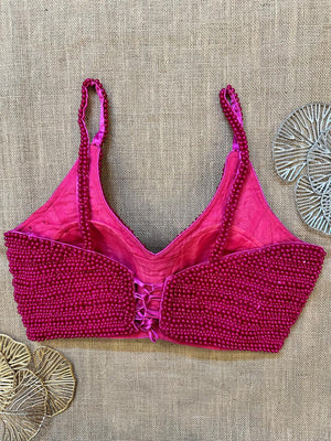Stunning pink bead work party blouse. Buy designer blouse in USA from Pure Elegance.