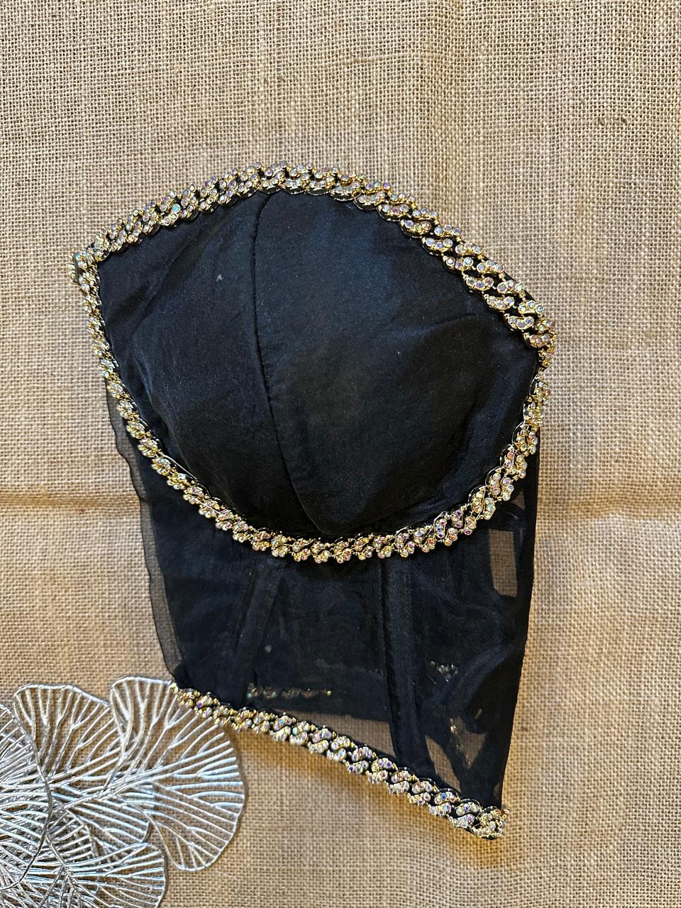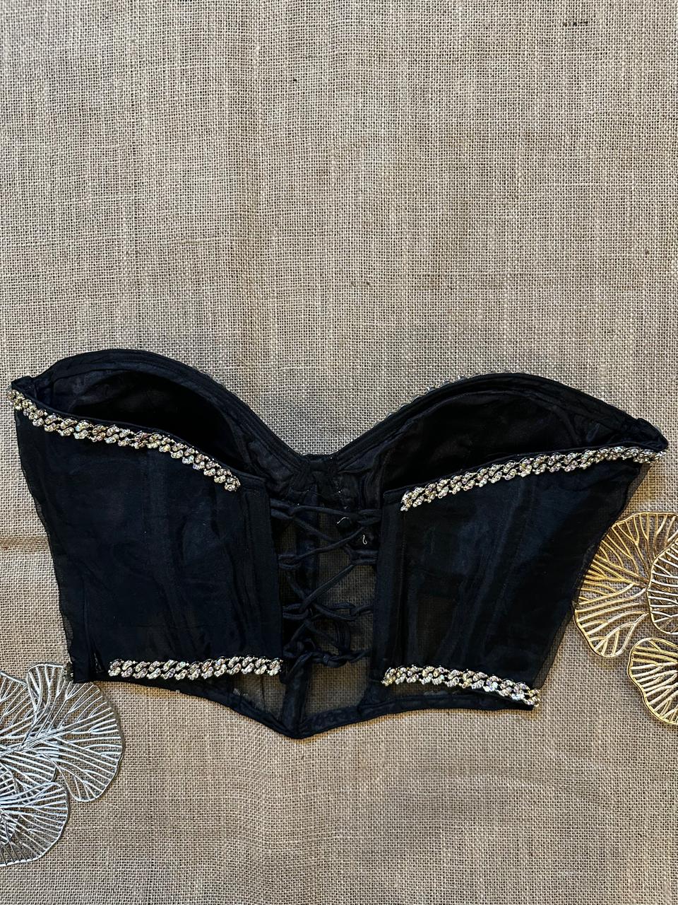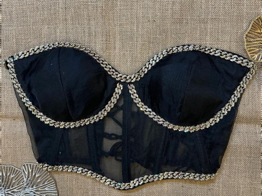 Stunning black embellished net corset blouse. Buy designer blouse in USA from Pure Elegance.
