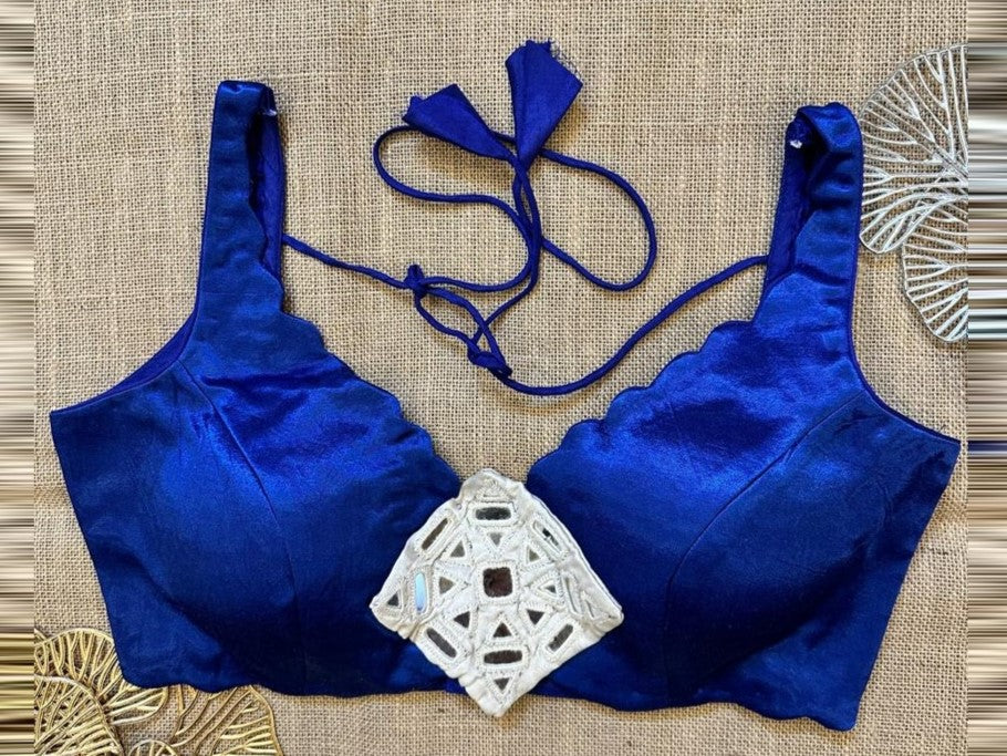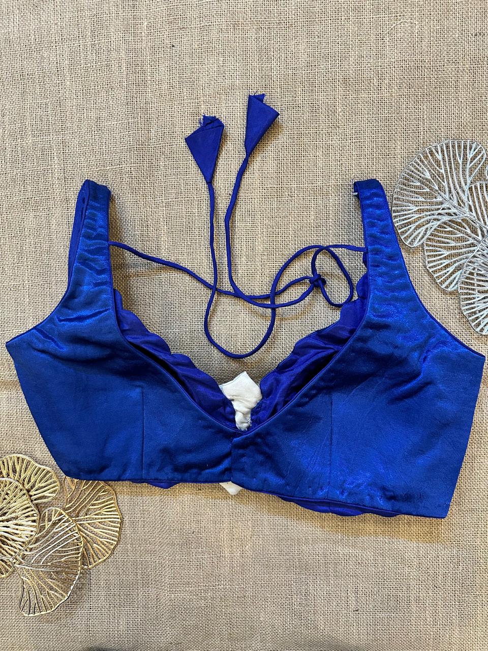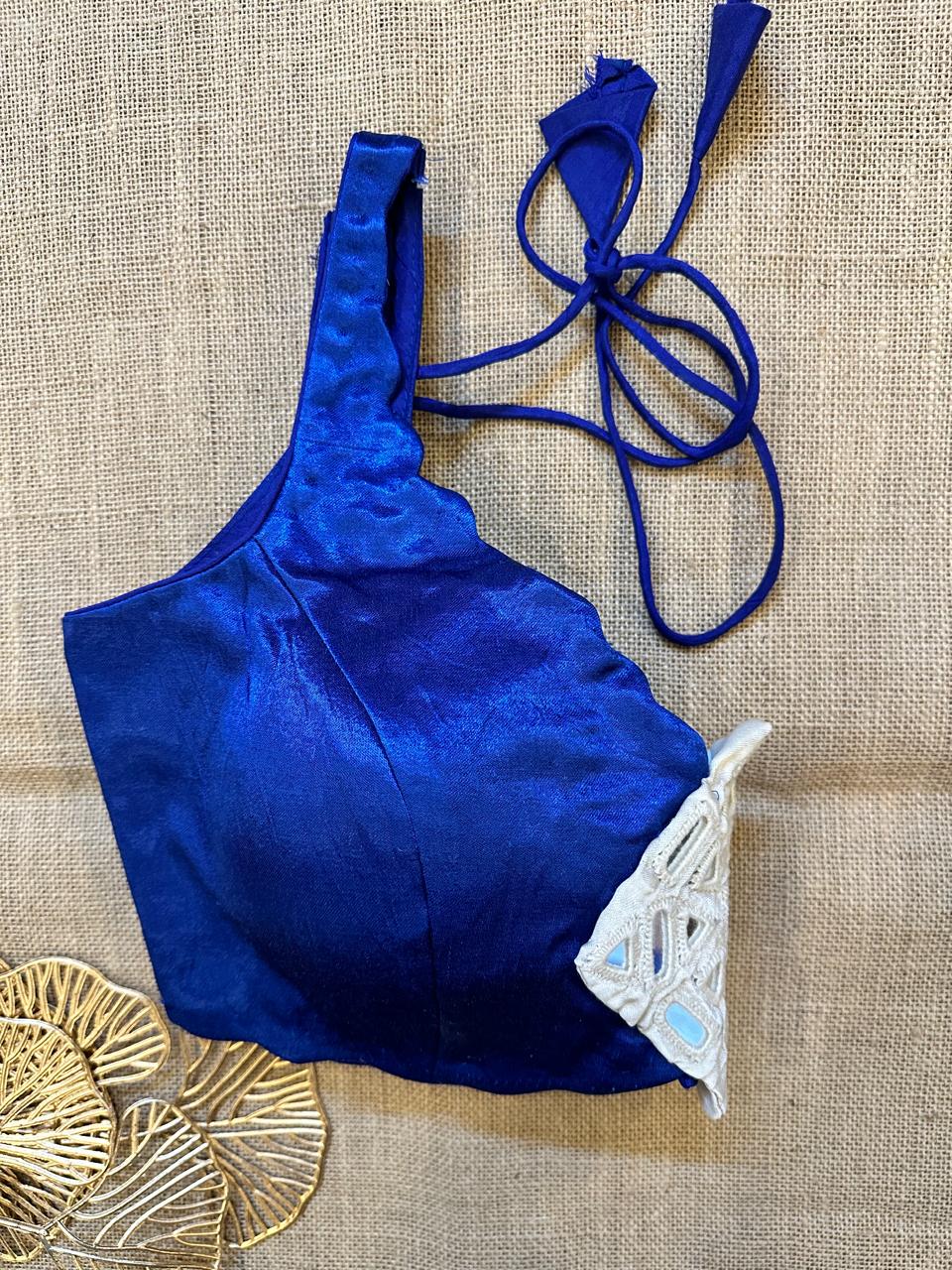 Stunning royal blue shimmer sleeveless designer blouse with mirror patch. Buy designer blouse in USA from Pure Elegance.