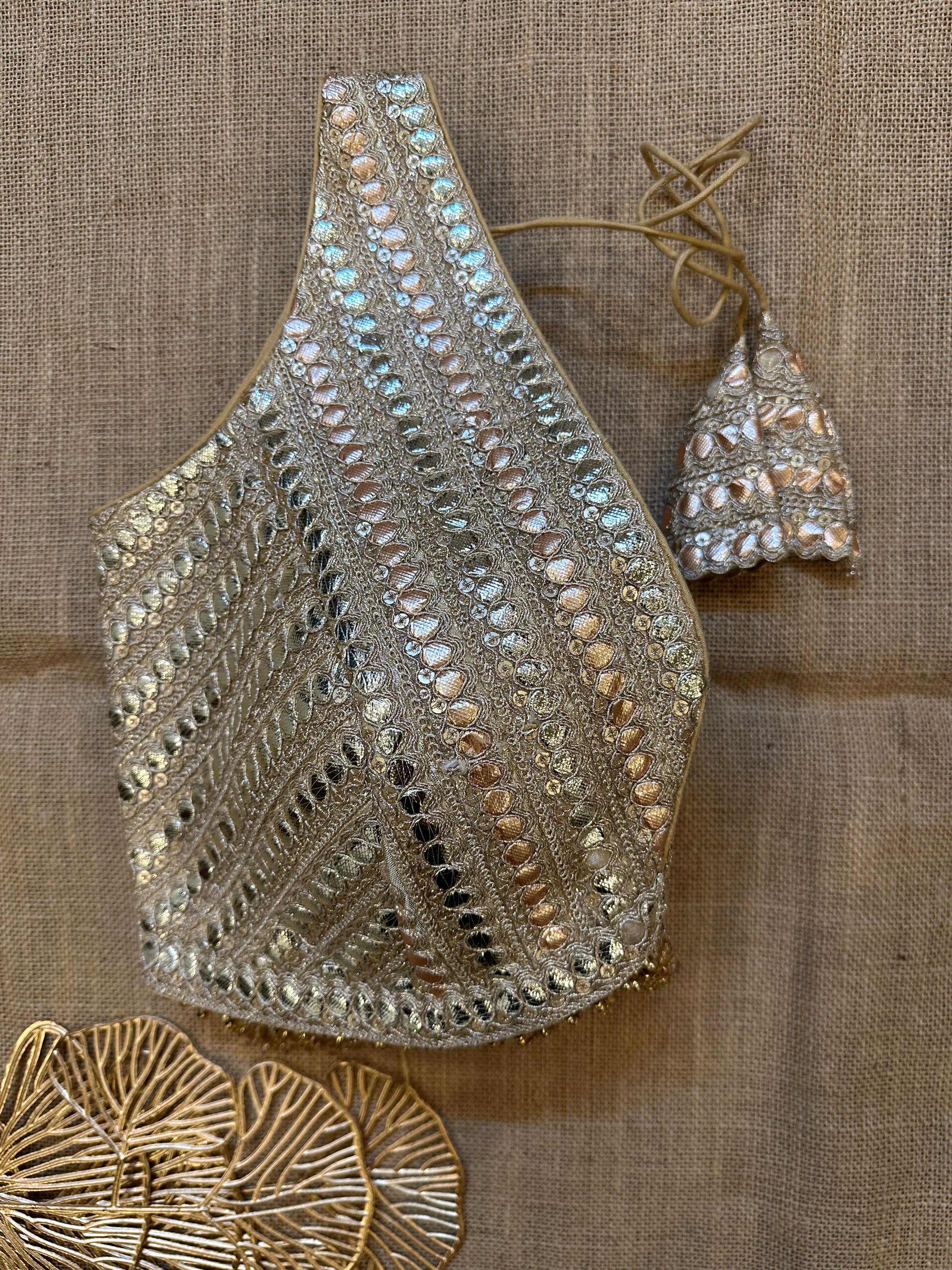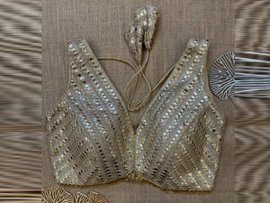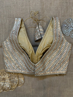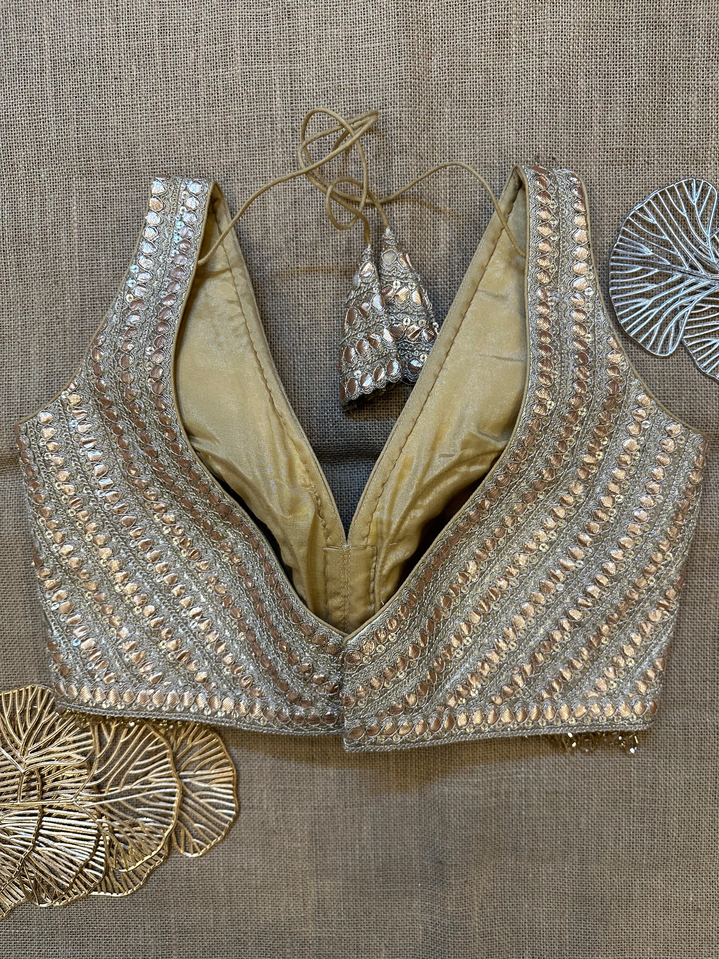 Stunning golden gota lace sleeveless saree blouse. Buy designer blouse in USA from Pure Elegance.