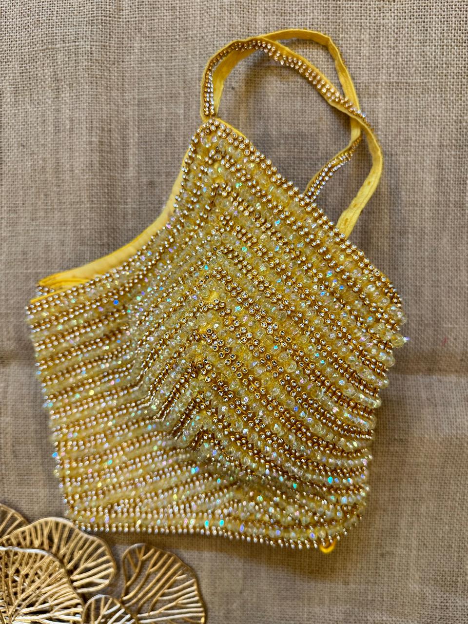 Stunning yellow bead work designer saree blouse, Buy designer blouse in USA from Pure Elegance.