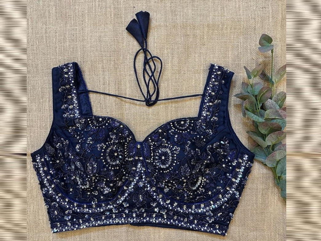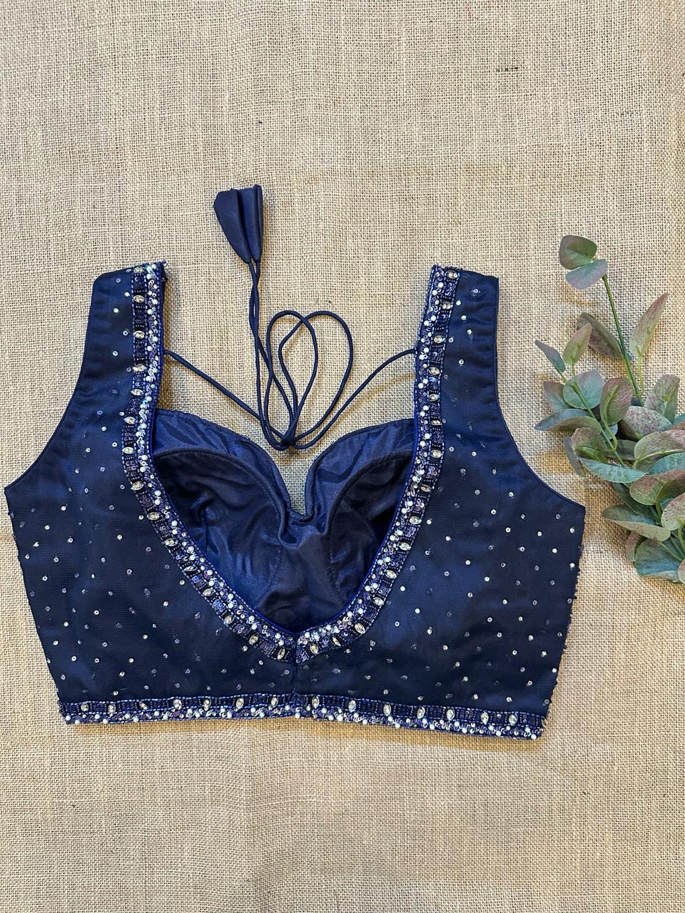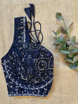 Stunning navy blue embroidered sleeveless designer saree blouse. Buy designer blouse in USA from Pure Elegance.