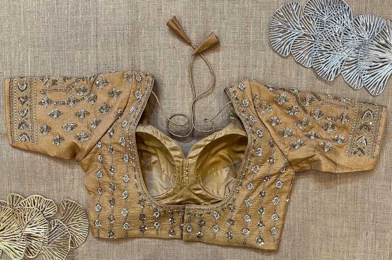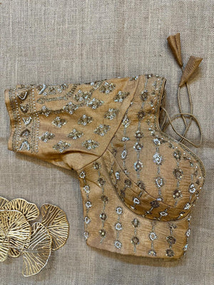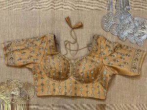 Stunning beige choli cut heavy embroidery saree blouse. Buy designer blouse in USA from Pure Elegance.