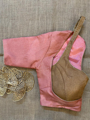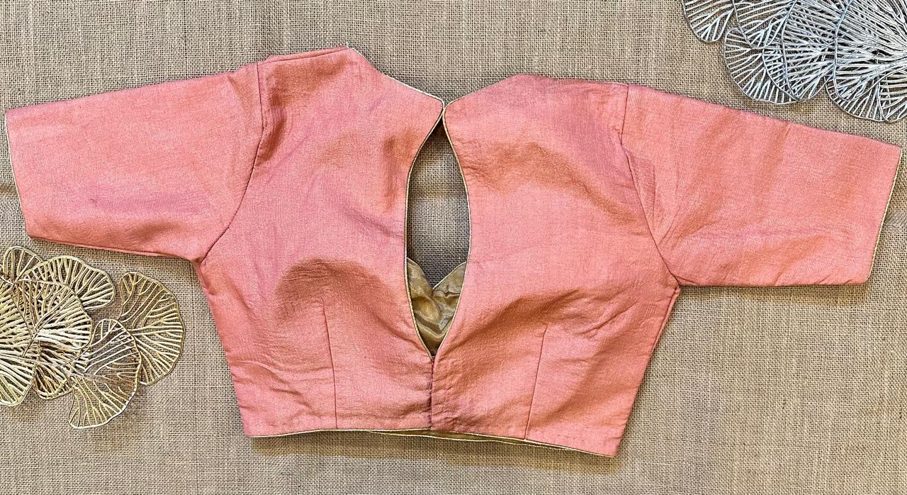 Stunning pink and beige designer saree blouse. Buy designer blouse in USA from Pure Elegance.