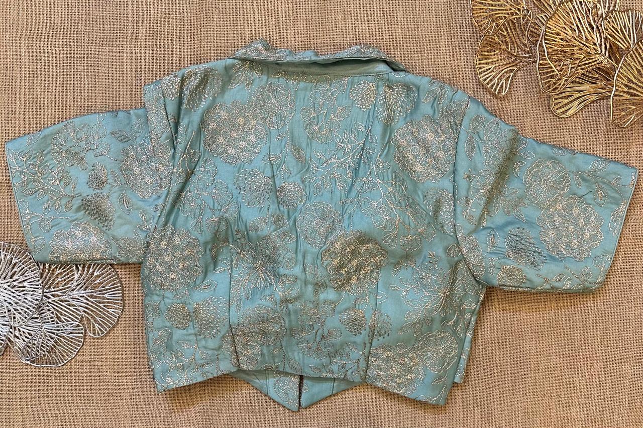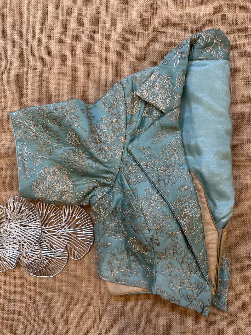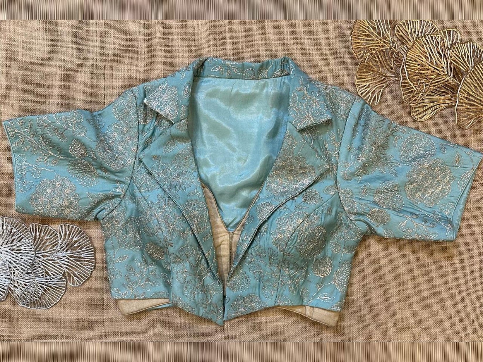 Stunning sky blue embroidered collar blouse. Buy designer blouse in USA from Pure Elegance.