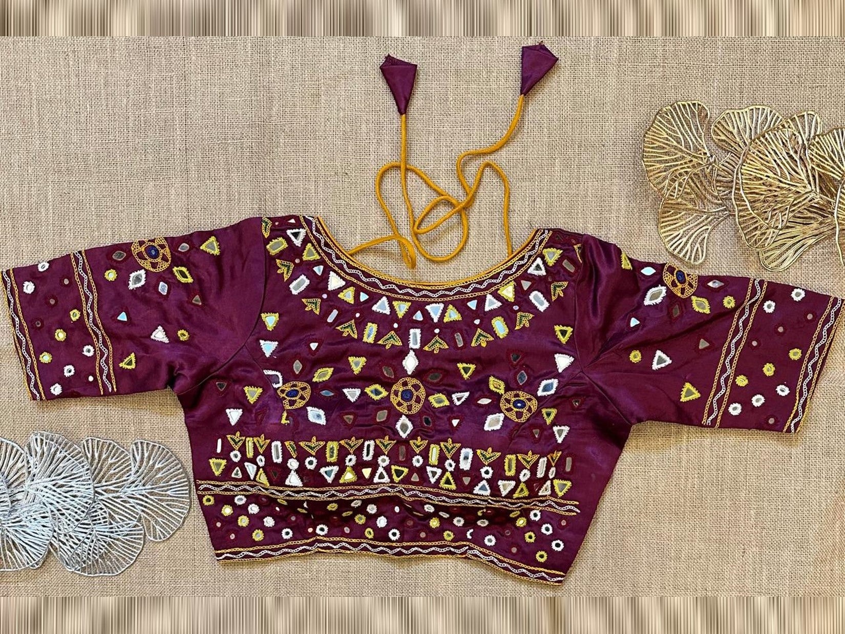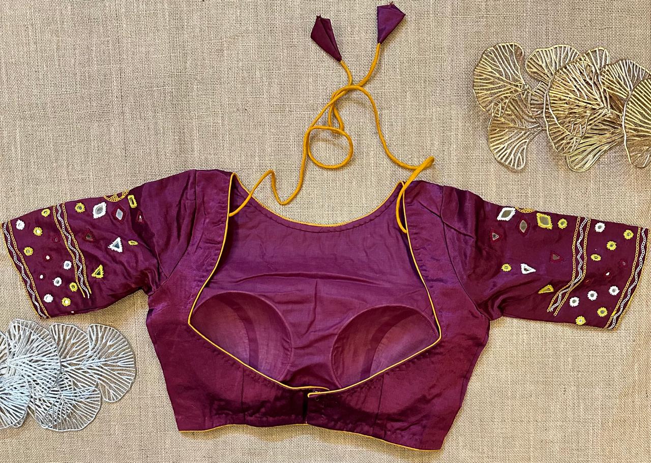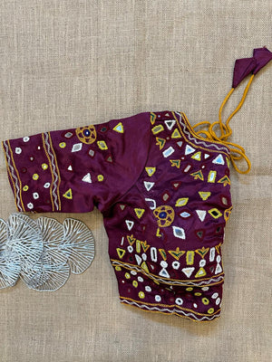 Stunning wine color multicolor mirror work designer blouse. Buy designer blouse in USA from Pure Elegance.