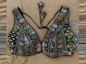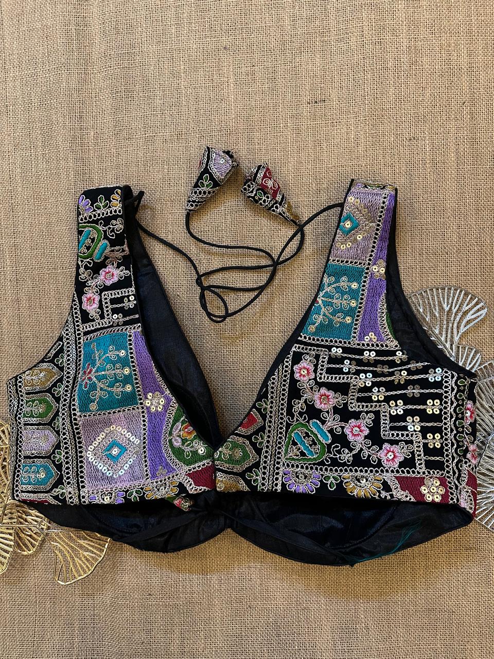 Stunning black designer blouse with multicolor thread embroidery. Buy designer blouse in USA from Pure Elegance.