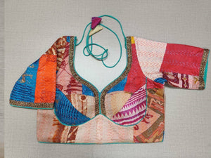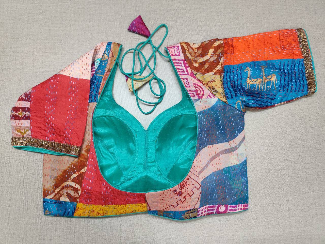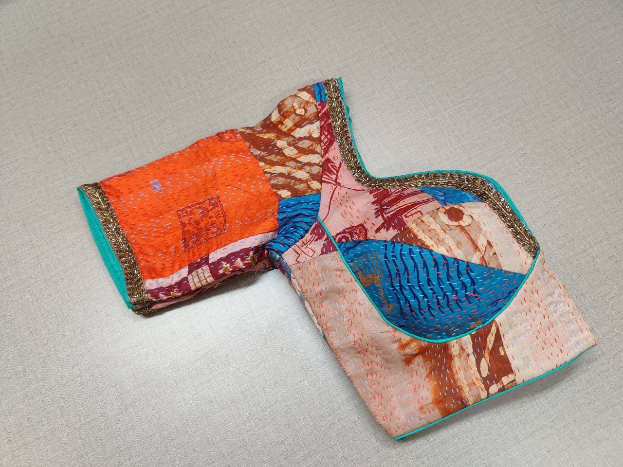 Stunning multicolor Kantha stitch blouse with embroidered lace. Buy designer blouse in USA from Pure Elegance.