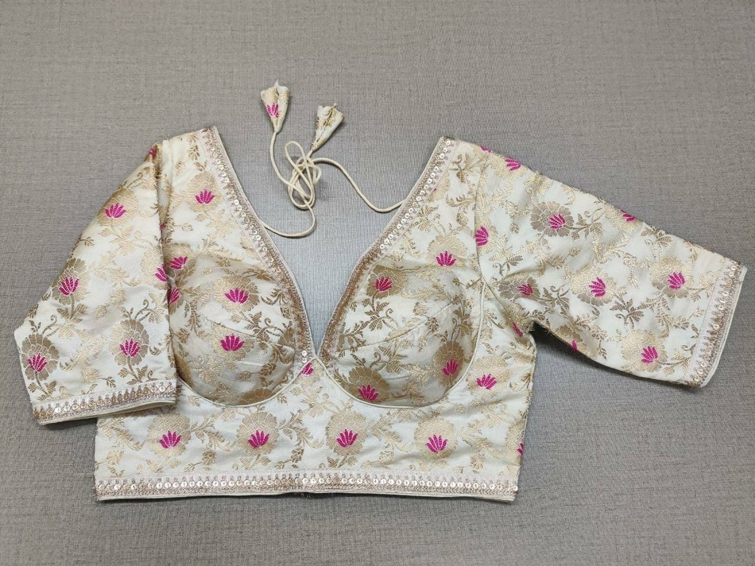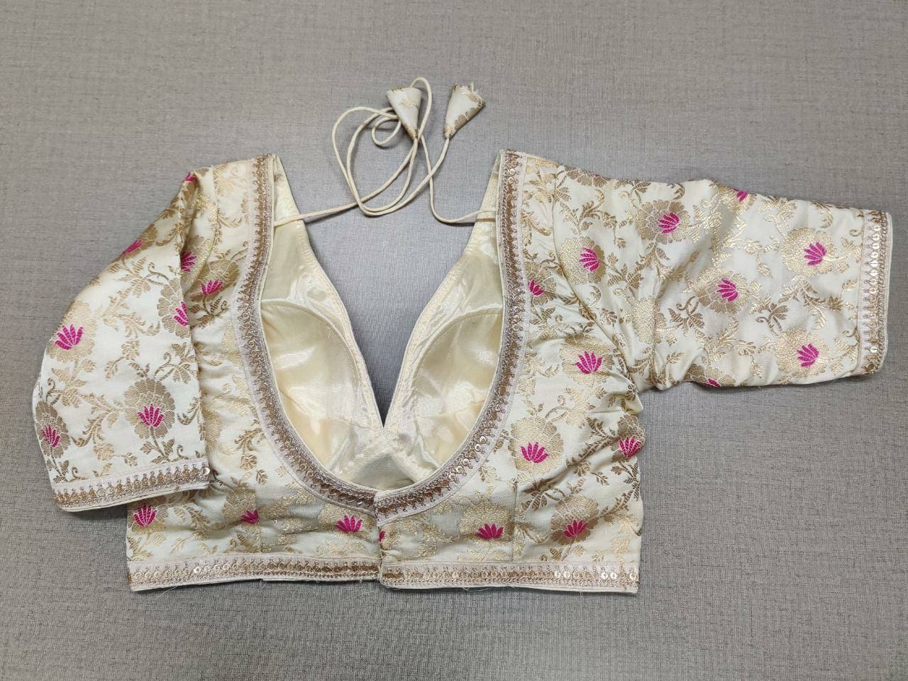 Stunning white Banarasi Minakari zari blouse with golden lace. Buy designer blouse in USA from Pure Elegance.