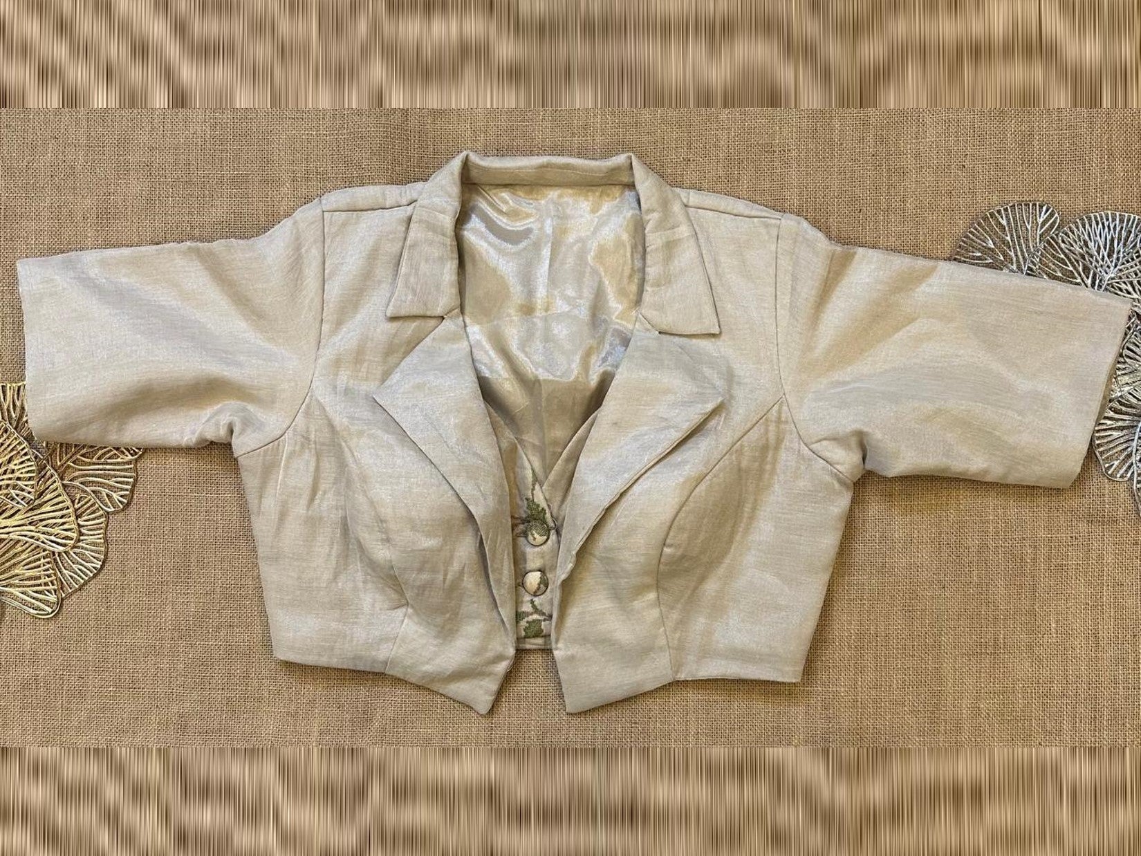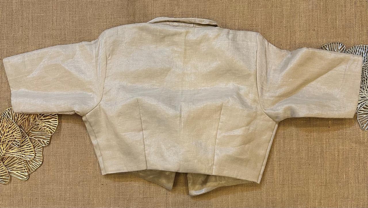 Stunning light grey tissue embroidered jacket blouse. Buy designer blouse in USA from Pure Elegance.