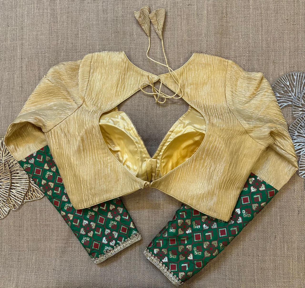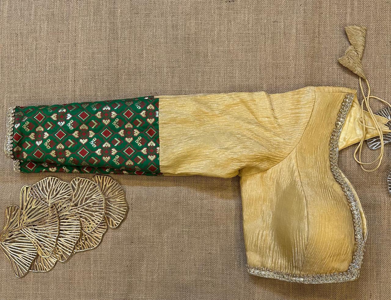 Stunning golden tissue blouse with green Paithani sleeves. Buy designer blouse in USA from Pure Elegance.