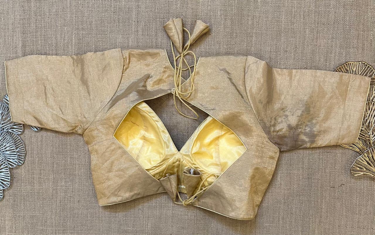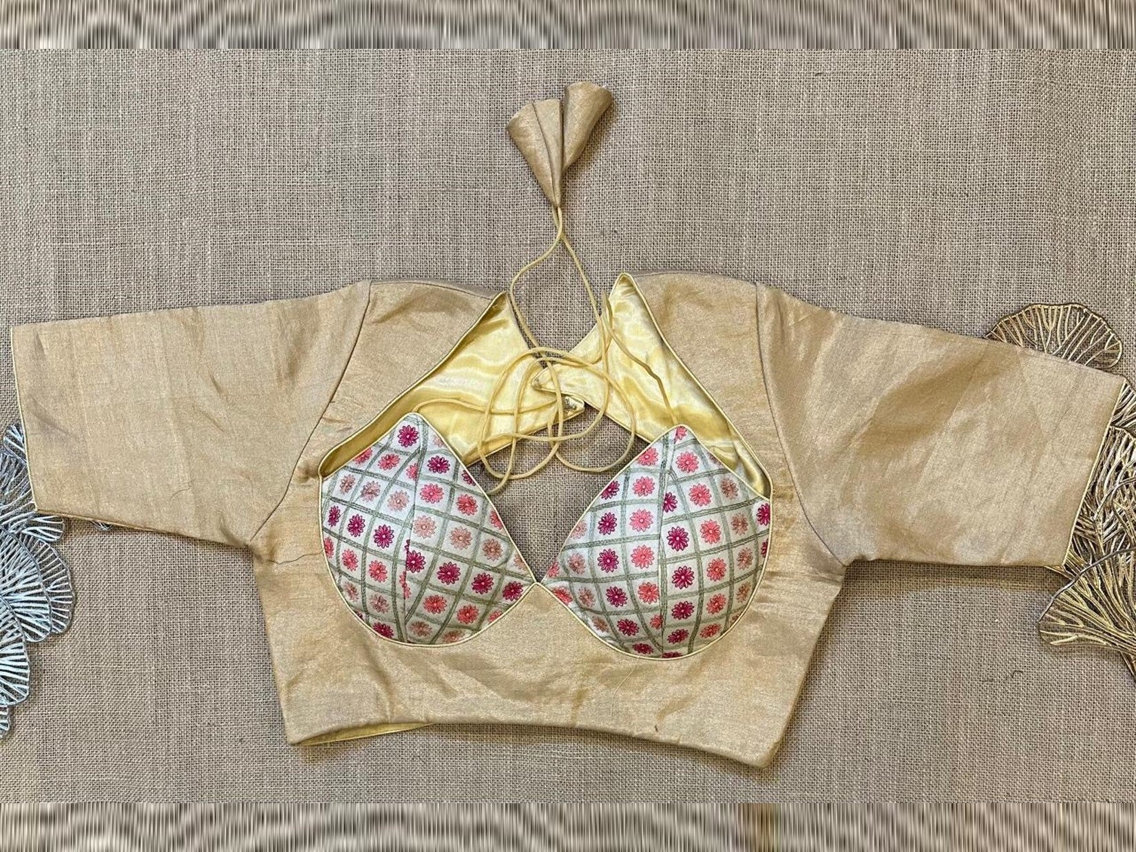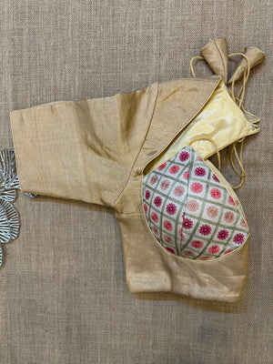 Stunning golden and white floral designer blouse. Buy designer blouse in USA from Pure Elegance.