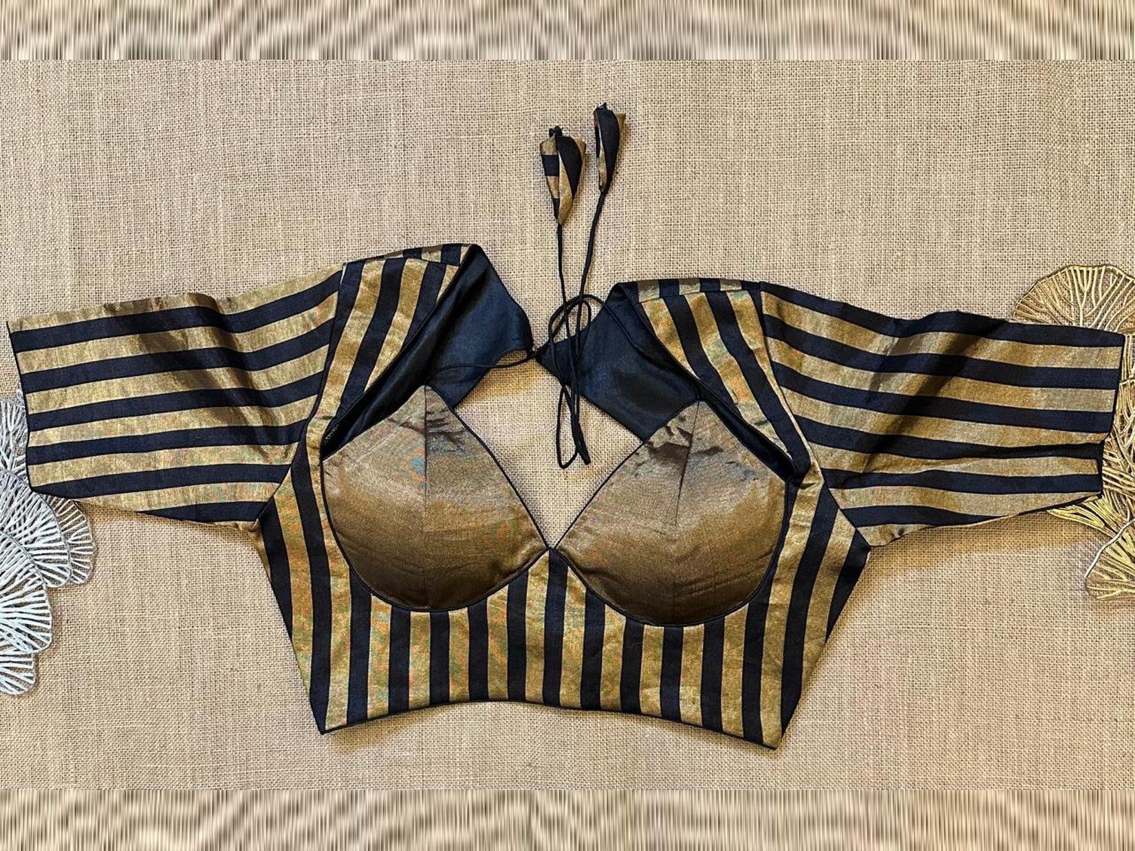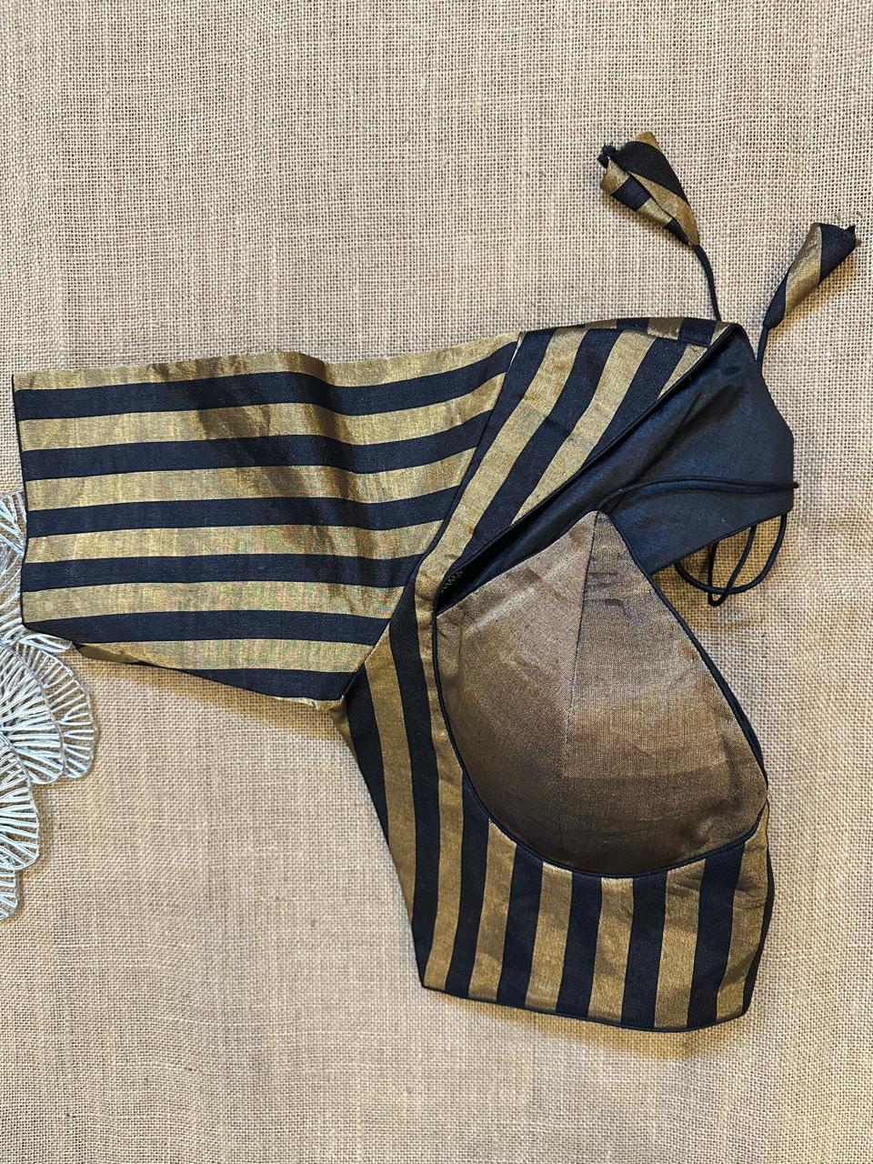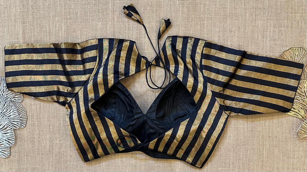 Stunning golden black striped designer saree blouse. Buy designer blouse in USA from Pure Elegance.
