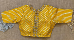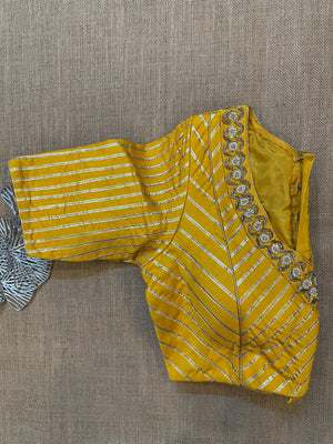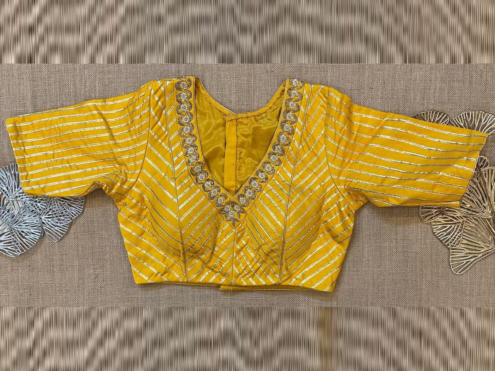 Stunning yellow gota work saree blouse with embroidered neckline. Buy designer blouse in USA from Pure Elegance.