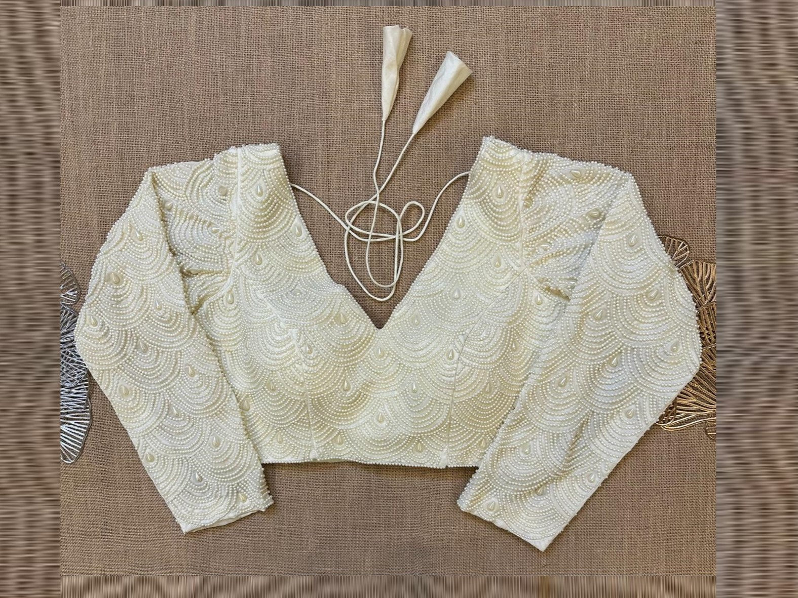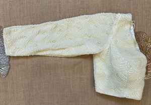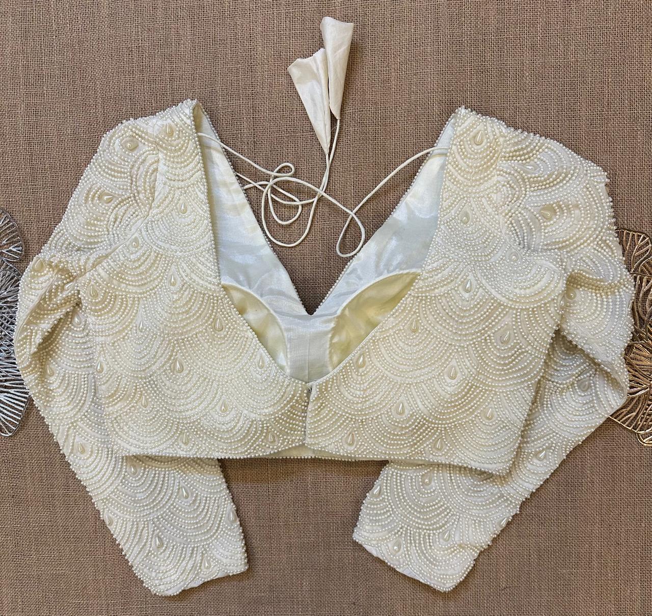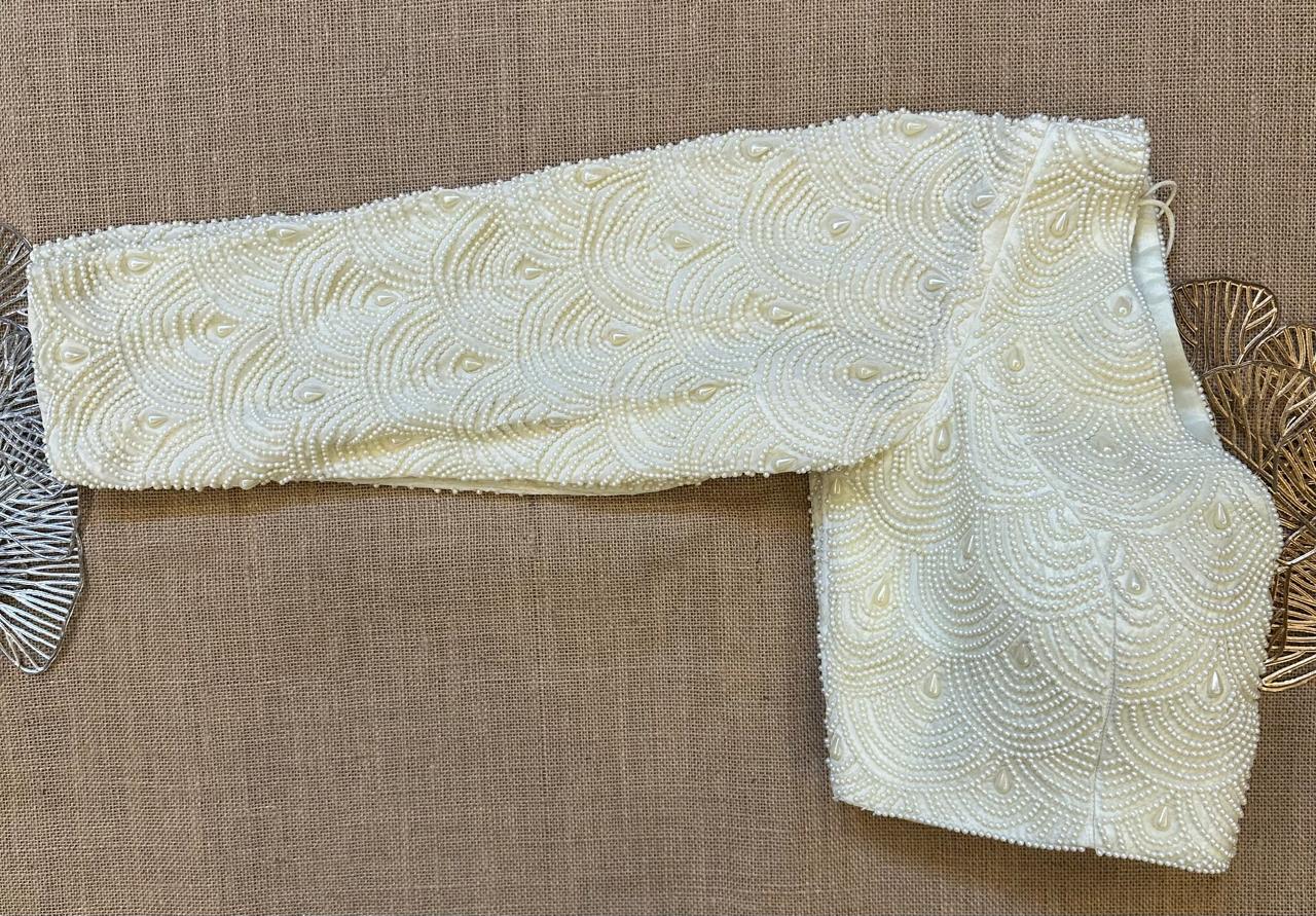 Stunning off-white fish scale pearl embroidery saree blouse. Buy designer blouse in USA from Pure Elegance.