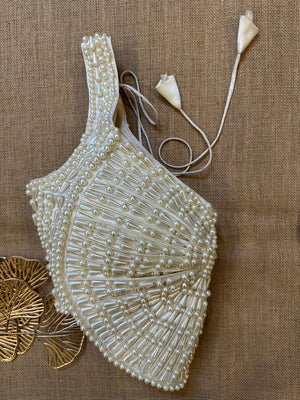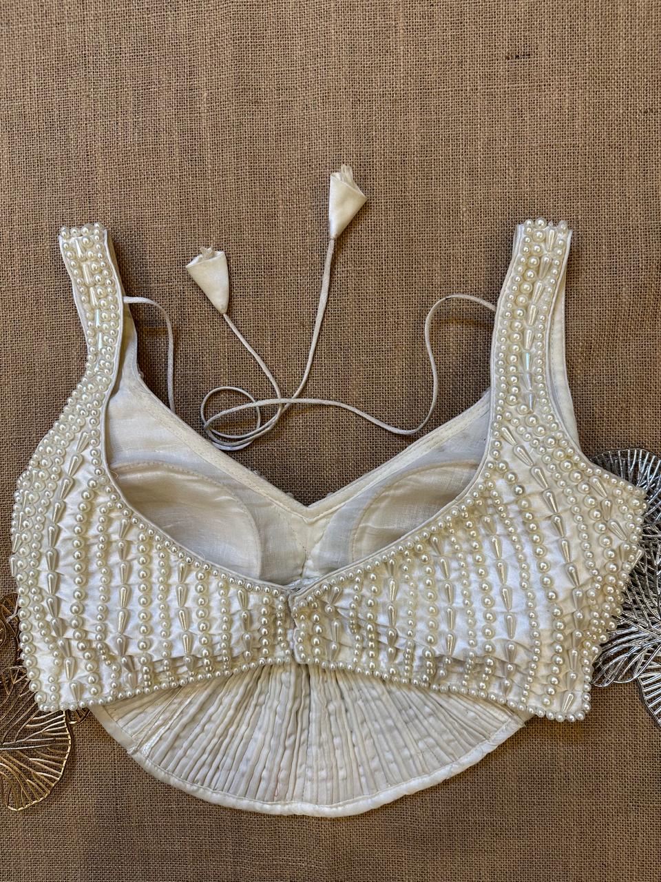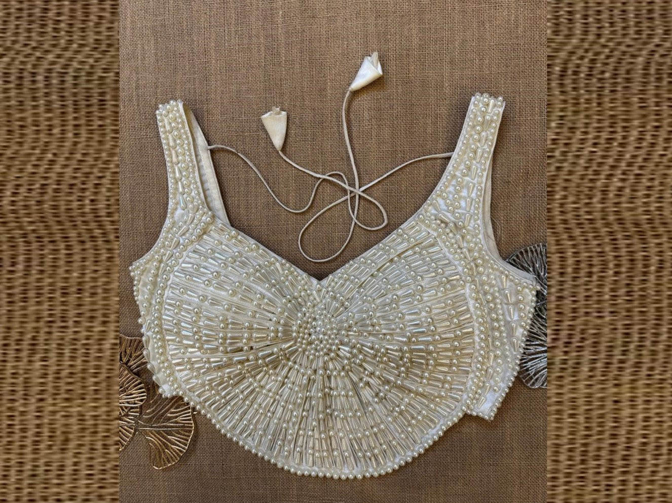 Stunning cream hand pearl embroidery designer sleeveless blouse. Buy designer blouse in USA from Pure Elegance.