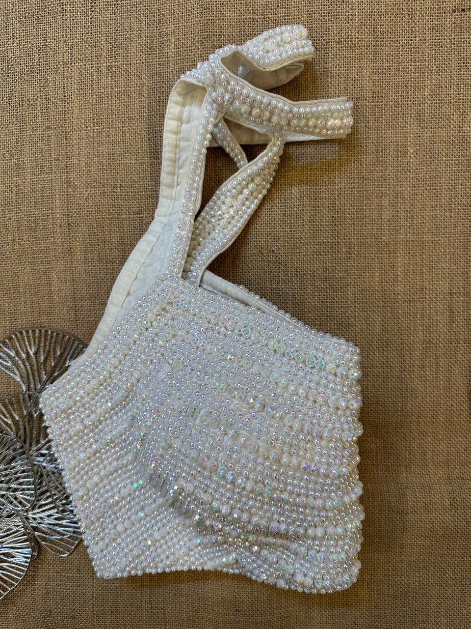 Stunning white bead work halter saree blouse. Buy designer blouse in USA from Pure Elegance.
