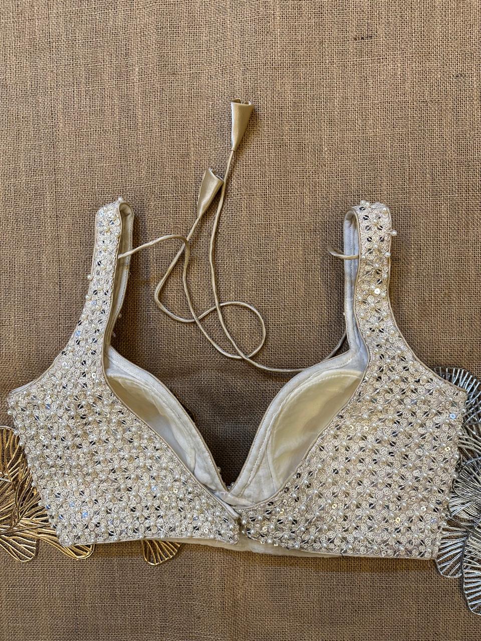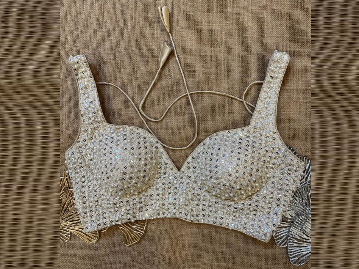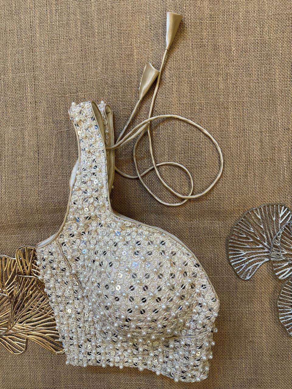 Stunning cream pearl and sequin work designer saree blouse. Buy designer blouse in USA from Pure Elegance.