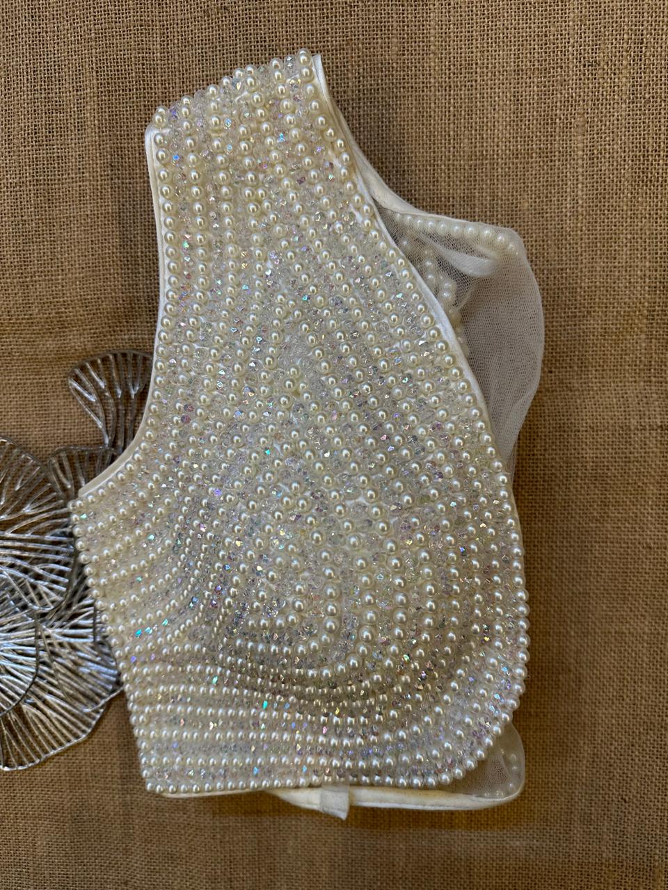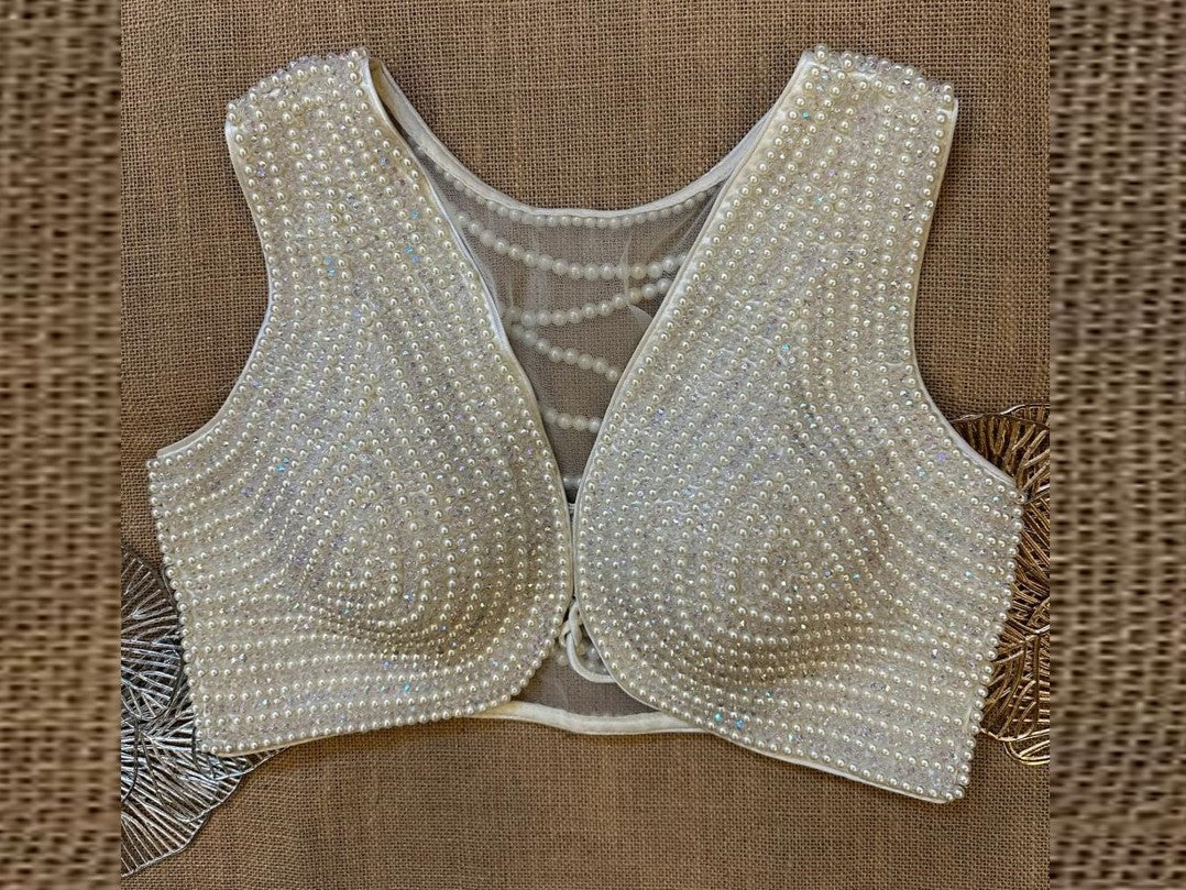 Stunning off-white pearl beads sleeveless saree blouse. Buy designer blouse in USA from Pure Elegance.