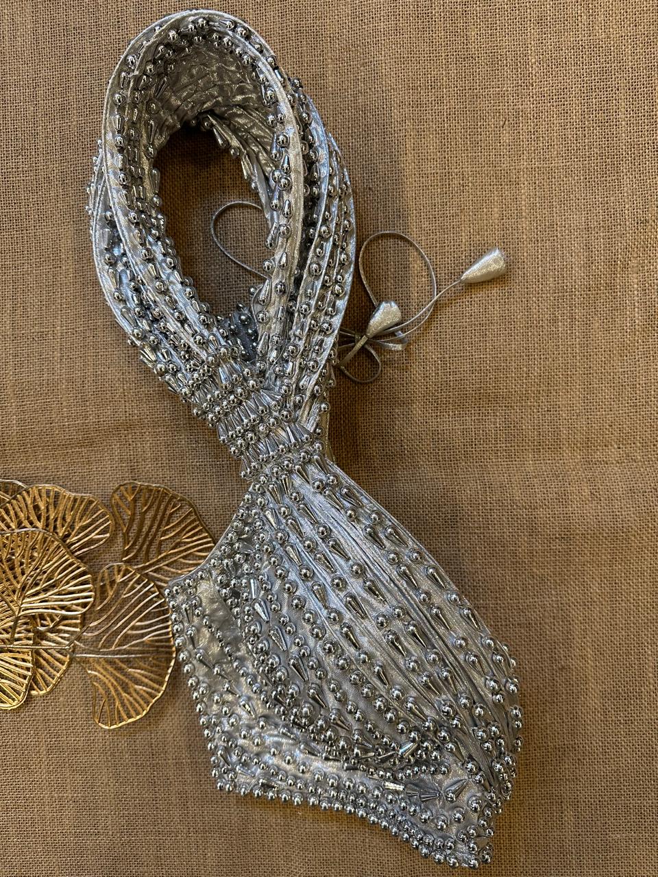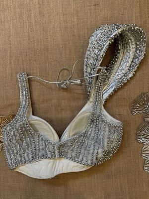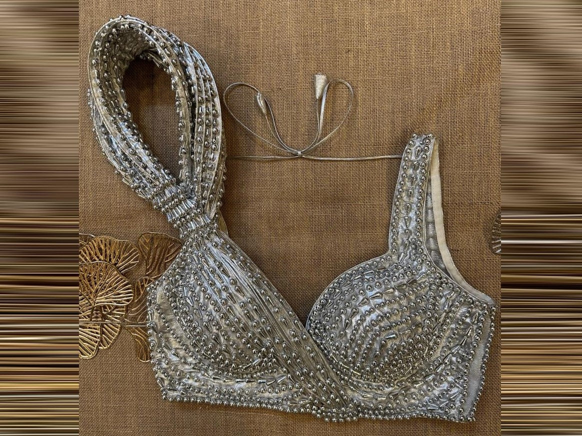 Stunning silver bead work statement blouse. Buy designer blouse in USA from Pure Elegance.