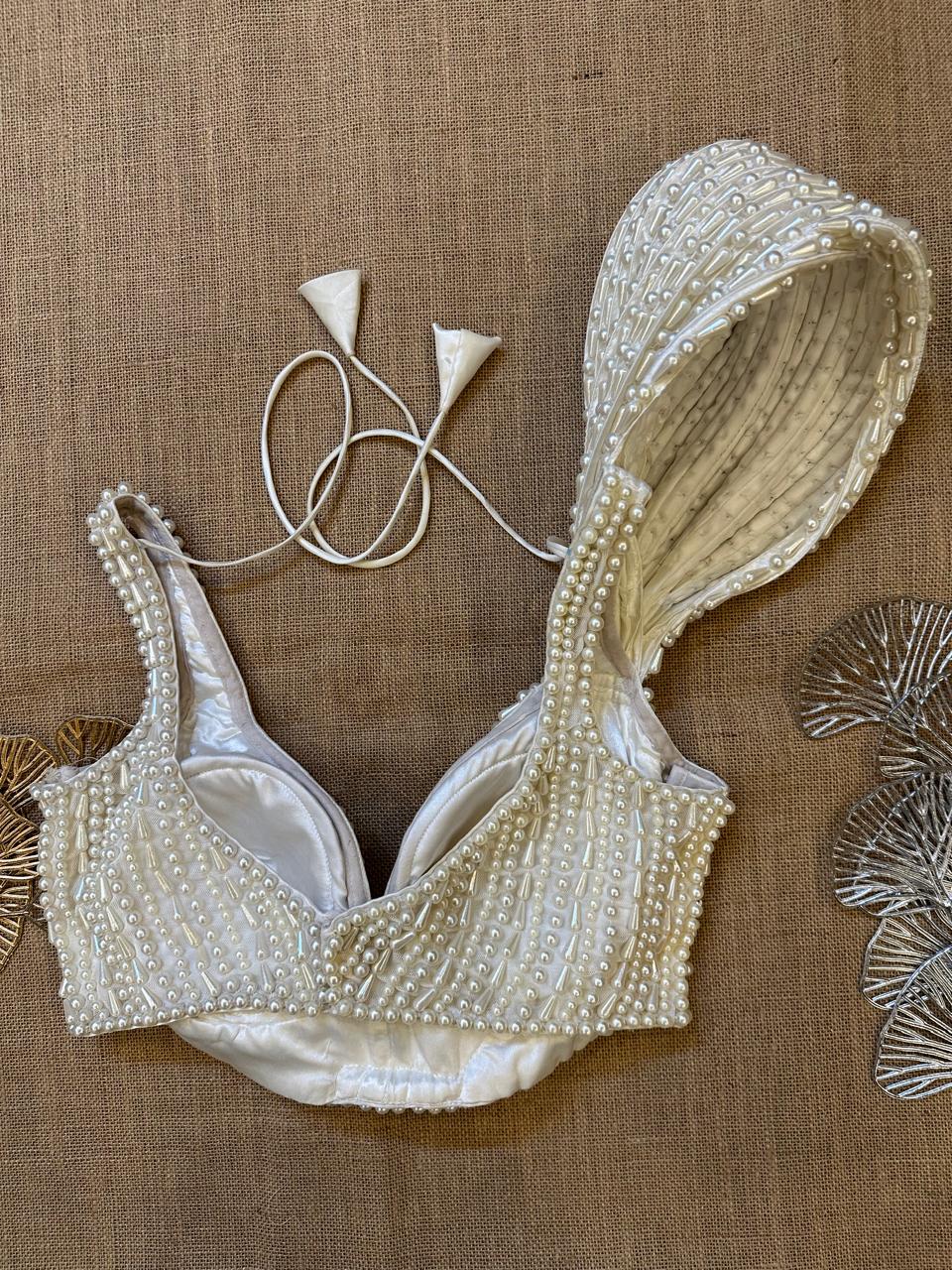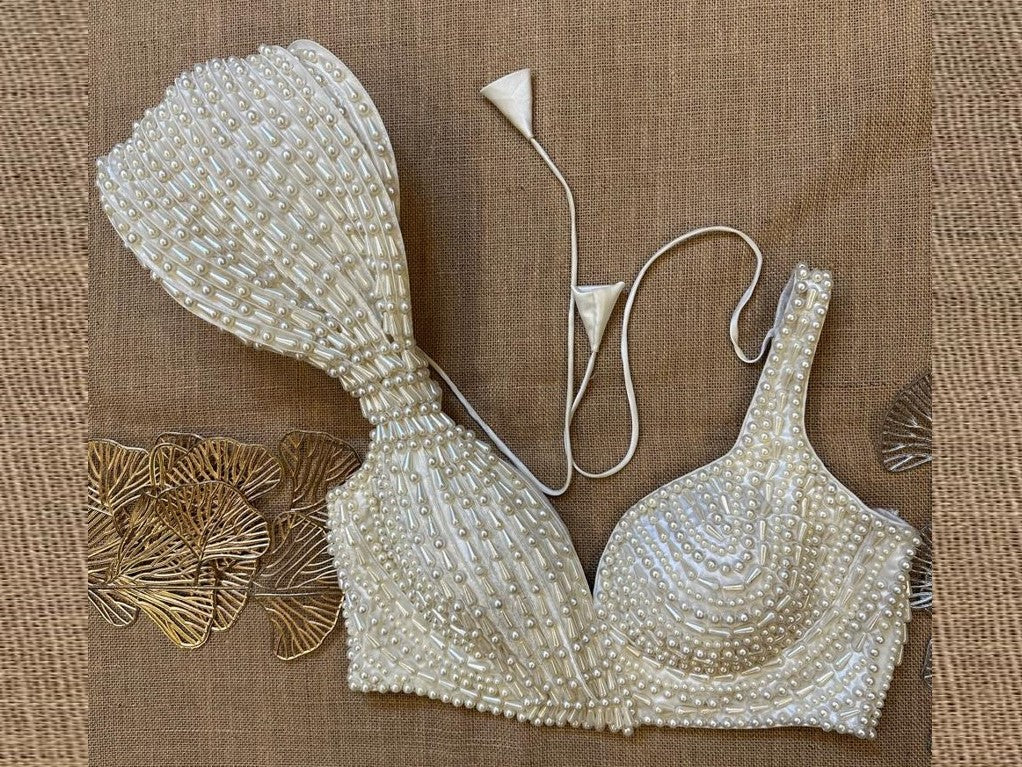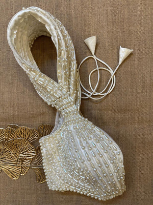 Stunning off-white bead work statement blouse. Buy designer blouse in USA from Pure Elegance.
