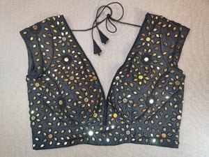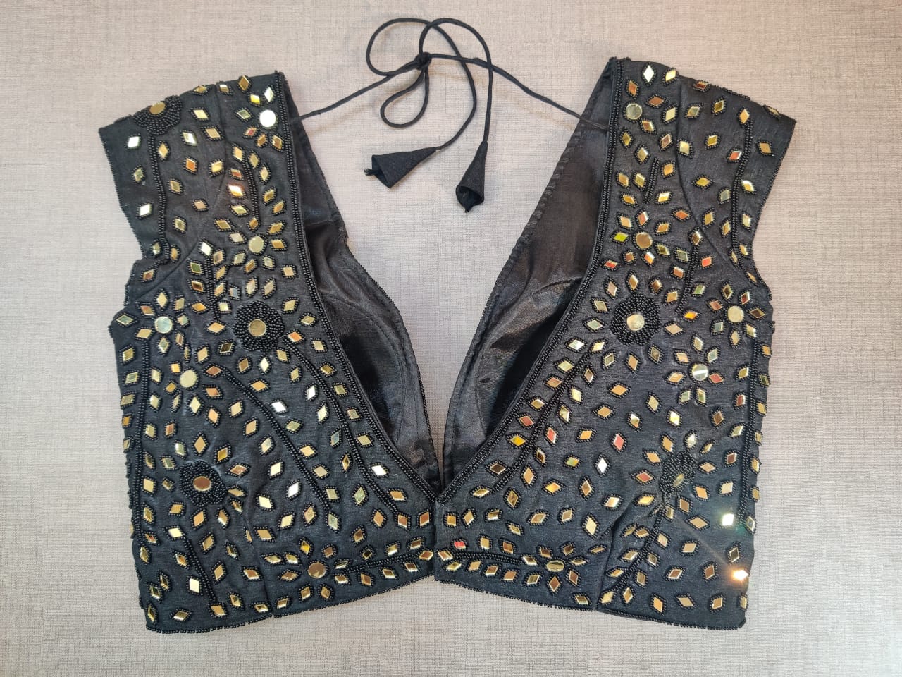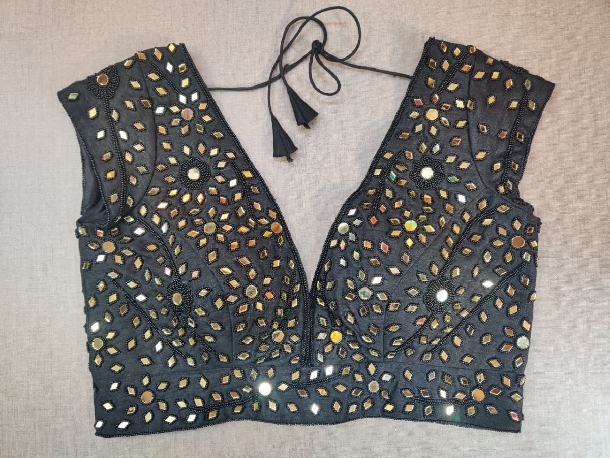 Exquisite black color mirror work designer. It has a V back and tassels to tie up. Pairs it with a contrasting saree to make your look more graceful. Perfect blouse for cocktail parties. Buy this designer blouse in the USA from Pure Elegance.