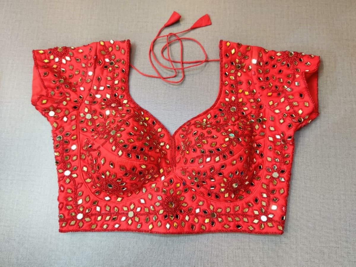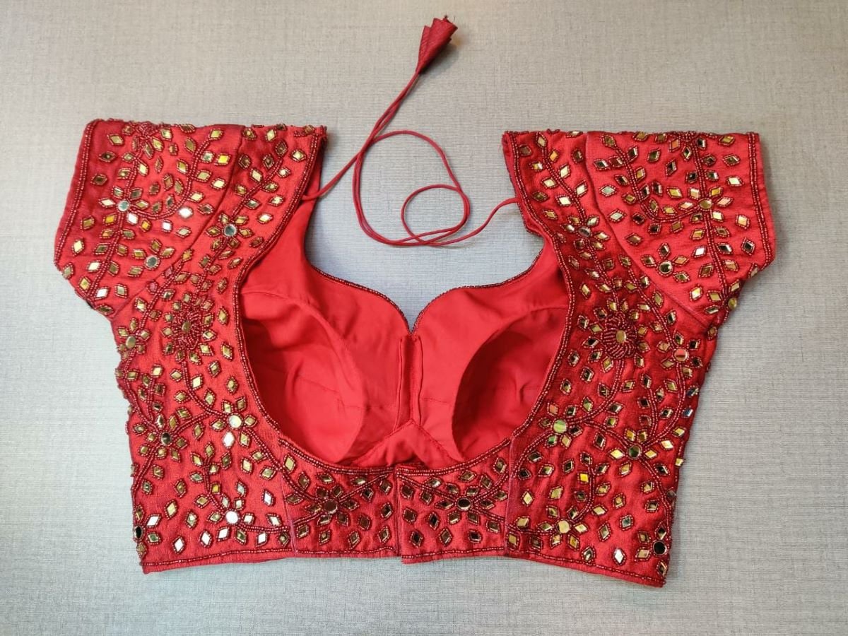 Exquisite red blouse with mirror work, short sleeves, U shape front. a beautiful back with a hook closure and tie-up. Pair this beautiful red blouse with a silk saree to make your look more elegant and graceful Buy this designer blouse in the USA from Pure Elegance.