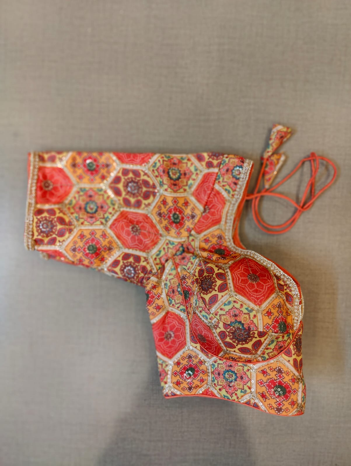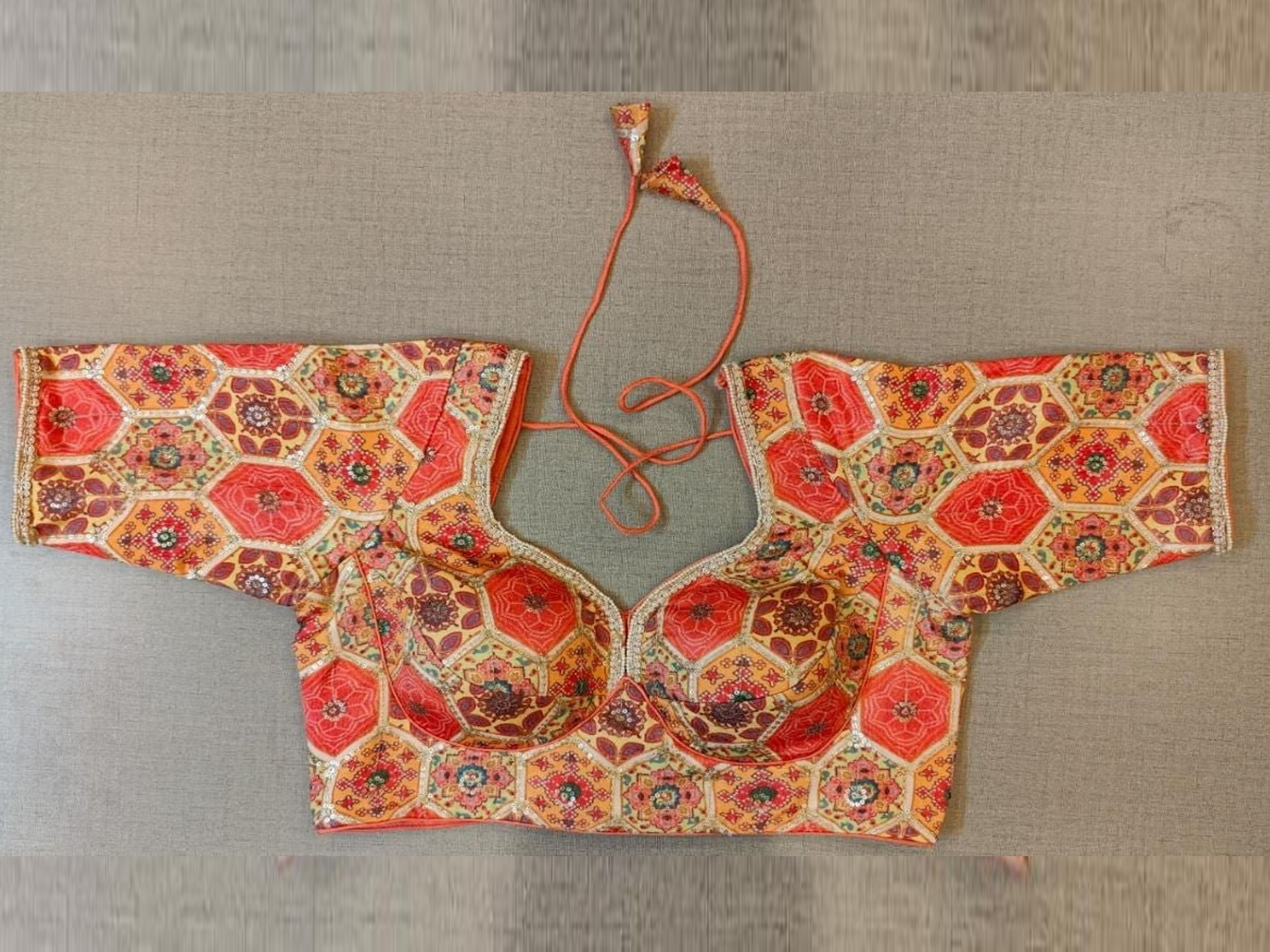 Women's orange Ajrakh Block Printed, padded Saree Blouse, has a U-neck, Hook & tie-up closure at back with 3/4th sleeves. Classic is never old and enough to have in your closet!! Pair this fashionable blouse with a beautifully printed sari and statement neckpiece and you are good to go! Buy this designer blouse in the USA from Pure Elegance.